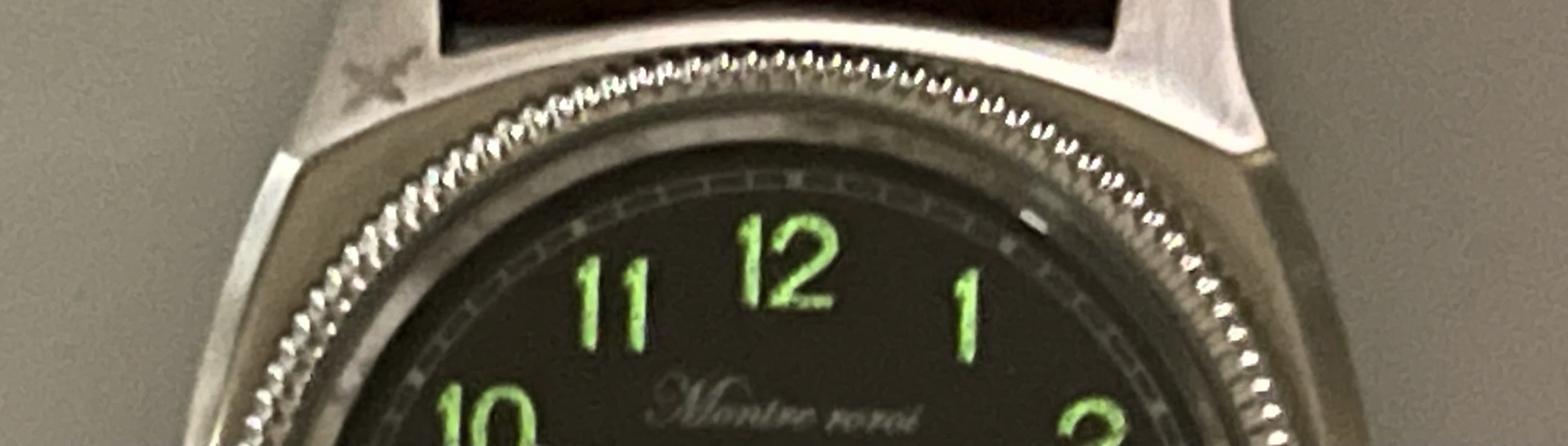 もともとは黒文字盤に白の時間表示、これ以上の視認性はありません。オリジナルのヴィンテージ時計は、約100年の経過で蓄光印刷のアラビア数字になんとも言えないブラウン色変化を施しています。M.R.M.Wのマジェテック ビッグタートルは程良く変色した色を再現しています。見た目はアンティークですが蓄光機能は健在です。