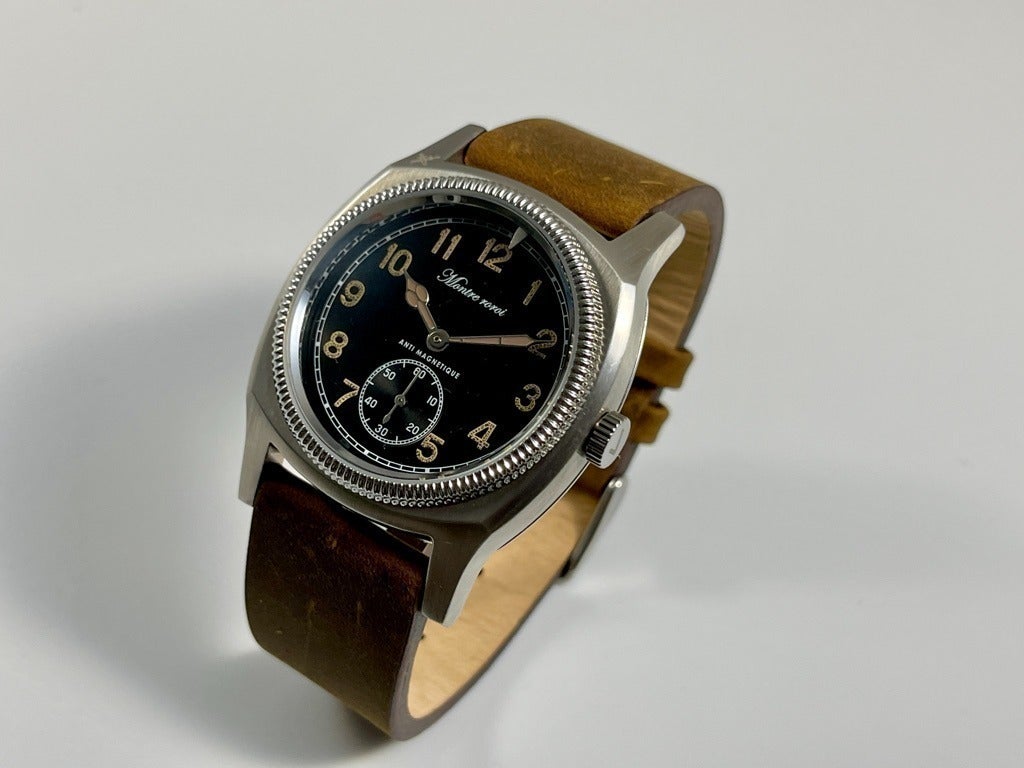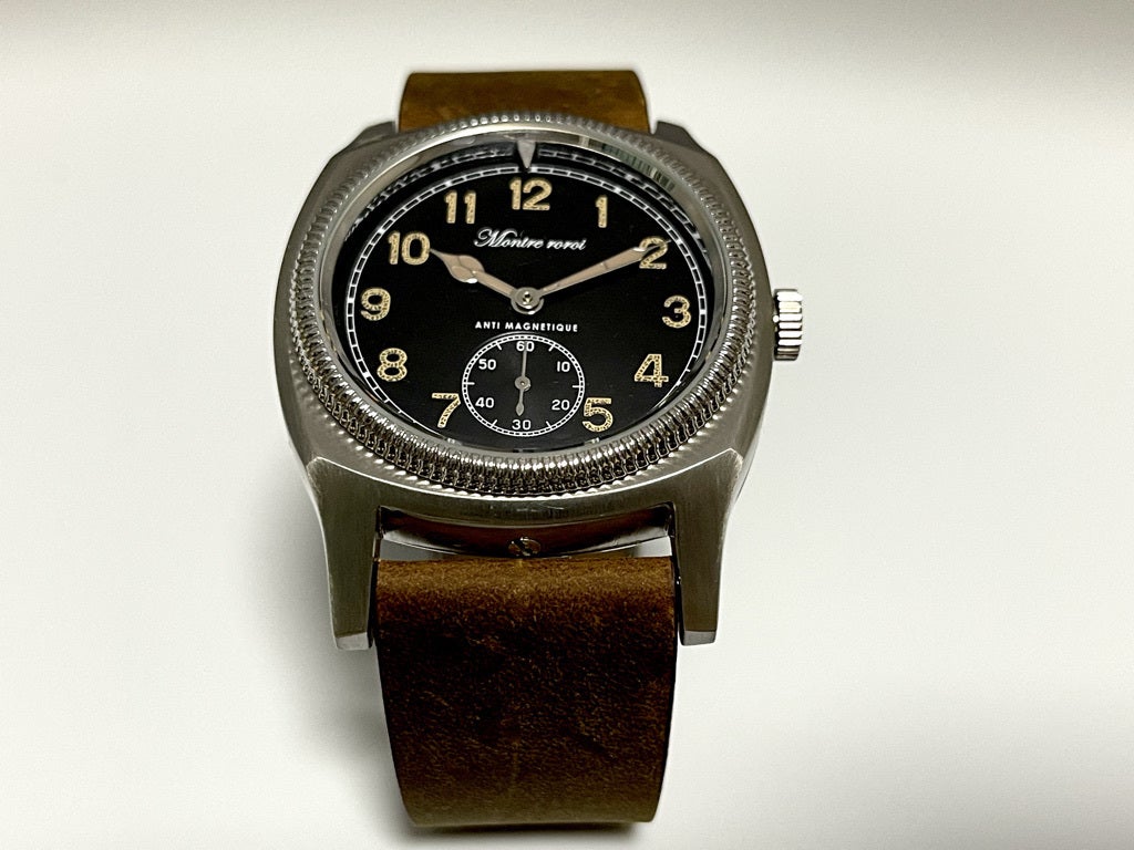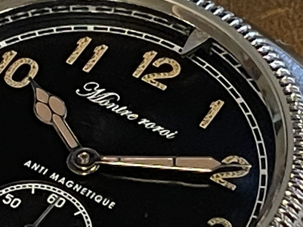 文字盤12時側に筆記体で製造者”Montre roroi” モントルロロイのロゴ、そしてスモールセコンドの上に“ANTI-MAGNETIQUE”の文字がプリントされています。