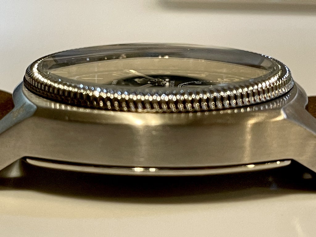 現代では然程大きくないサイズですが、当時の1935年の物にしてはかなり大きな時計でした。このサイズ感の腕時計は急速に発展し始めた航空時計の市場には必要なものであったといわれています。コインベゼルは一番ぶつけやすい風防周りに備え付け、傷を目立たなくし、またベゼルを滑らずに回転できるメリットもあります。