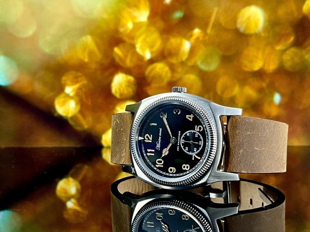 パイロット向けに作られたオリジナル時計は、コックピットに備え付けられた多くの計器に影響がある帯磁性を伴う時計を恐れていました。一方、現代に於ける時計も自動改札機やタブレット等の影響が時間を狂わす問題が多発しています。機械式はもちろんの事クォーツムーブメントの時間の狂いの原因の9割近くが磁気を帯びてしまう事だといわれています。約90年前と人類は同じ悩みを抱えています。耐磁プレートをムーブメントに添える事で大幅に『耐磁性』を強くする事ができました。