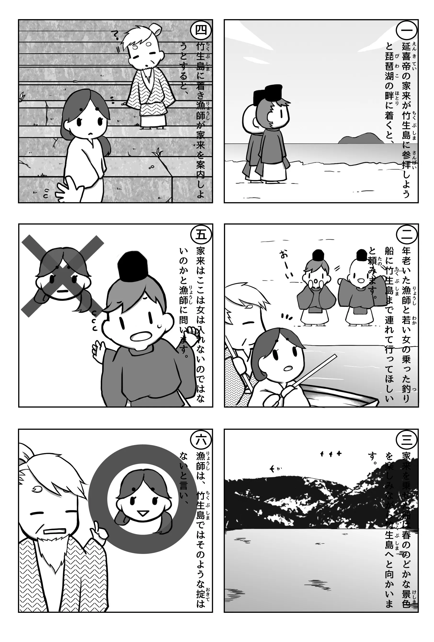 女もお参りをしようとするので、臣下は「竹生島は女が入ってはいけないところではありませんか」と問います。