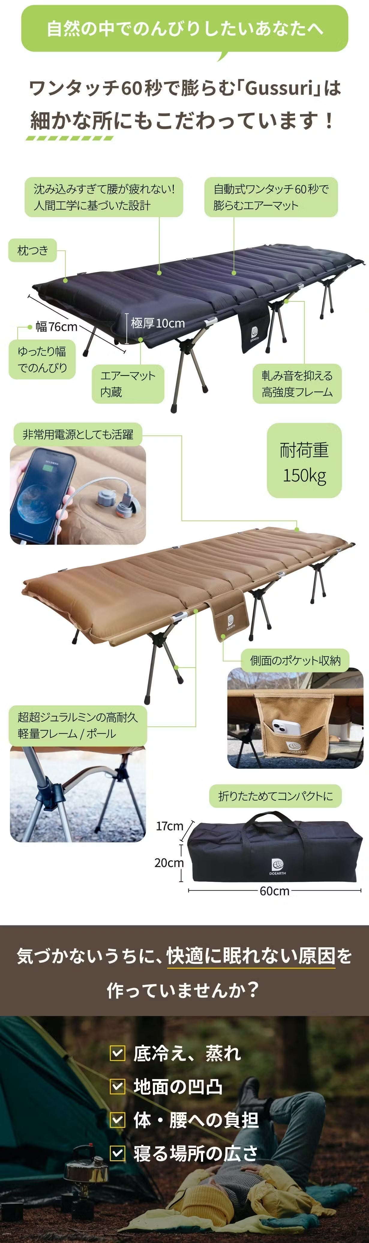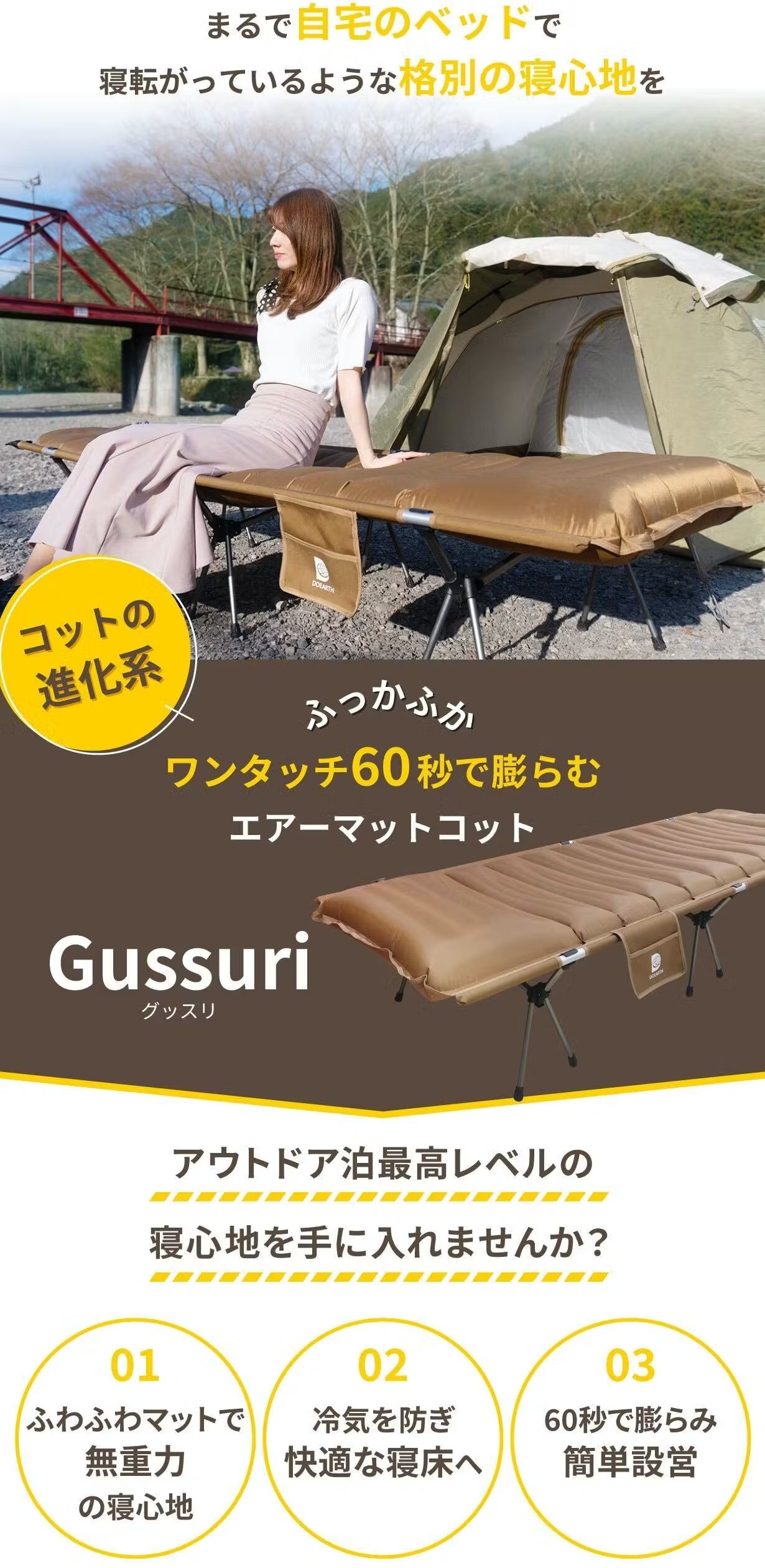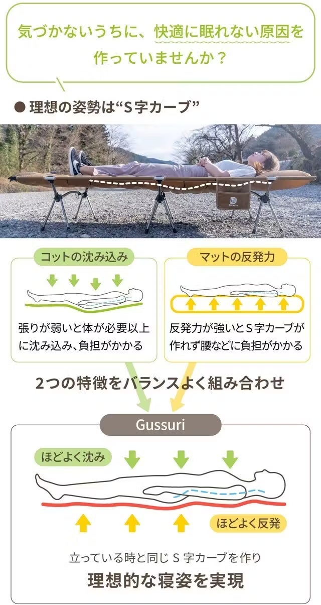 アウトドア泊での寝心地にこだわりきった "Gussuri”で、ぜひアウトドアの新鮮な空気に浸って心地よい1日の締めくくりを迎えてください!
