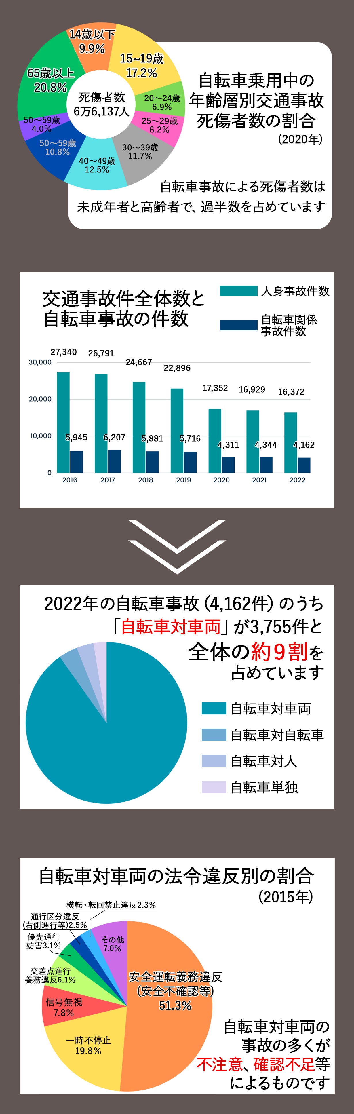 事故の中でも自転車事故は毎年多く起こっており、中でも未成年や高齢者が多く巻き込まれてしまっています。