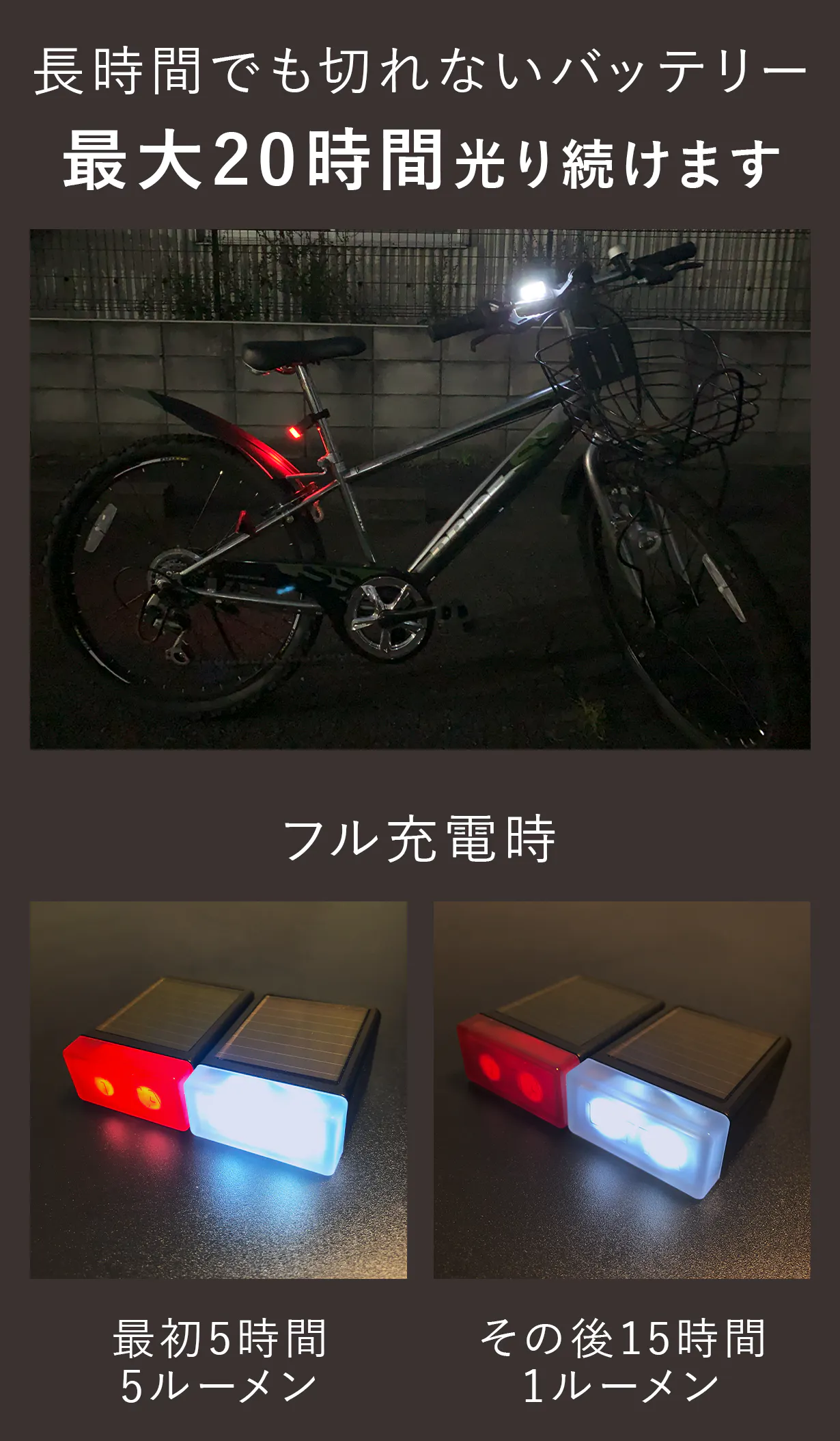 A. ソーラー充電を採用しているため、自転車を暗い屋内で保管している場合は日中に4時間以上太陽光に当てることで十分に充電されます。
