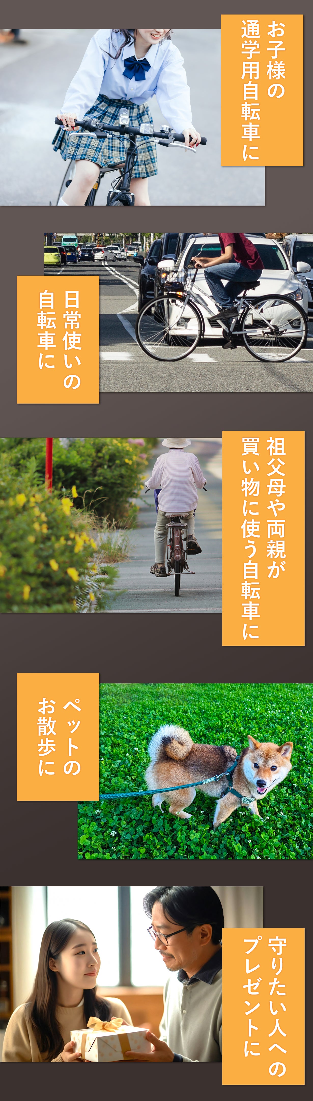 さまざまな利用シーンでLiTTA 2.0を活用することができます。お子様の通学用自転車や日常使いの自転車、祖父母や両親が買い物に使う自転車、ペットのお散歩など、守りたい人へのプレゼントとしても最適です。LiTTA 2.0は居場所を知らせて守るツールとして、幅広いシーンで活躍します。