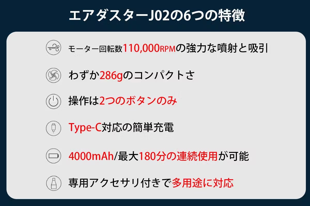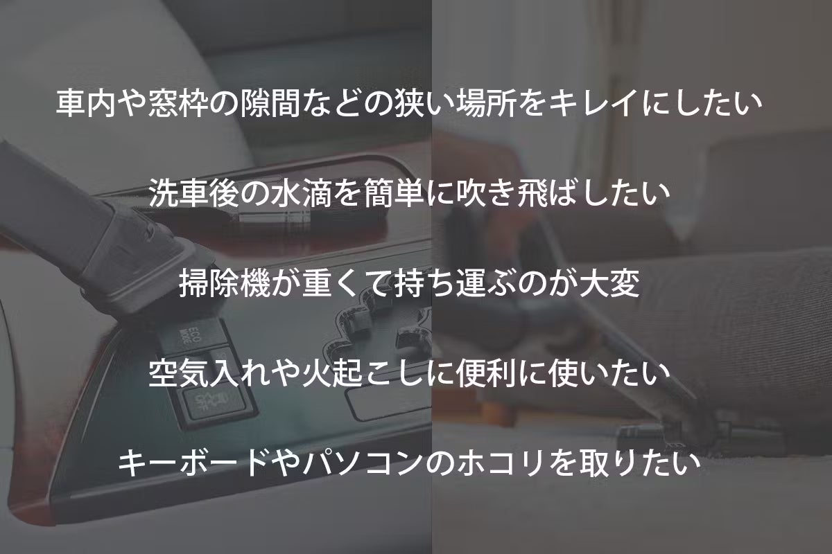 吸引&エア噴射の2way機能で車内のホコリや汚れだけでなく、家庭やアウトドアでの使用にも幅広く対応します。その上わずか286gの軽量設計だから持ち運びにも便利です!
