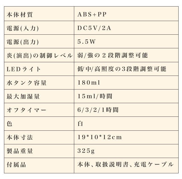 LEDの光とミストで3D焚き火気分が味わえる。大容量タンクで最大6時間連続加湿。アラームクロックとの組み合わせで便利。