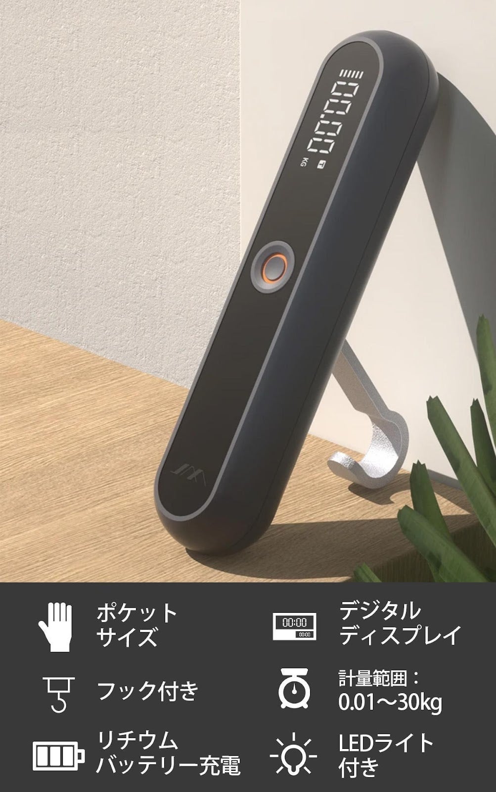 スマートな本体にフックがついているので、空港などでもスーツケースやカバンを簡単に測れ、重量オーバーを防ぐこともできます