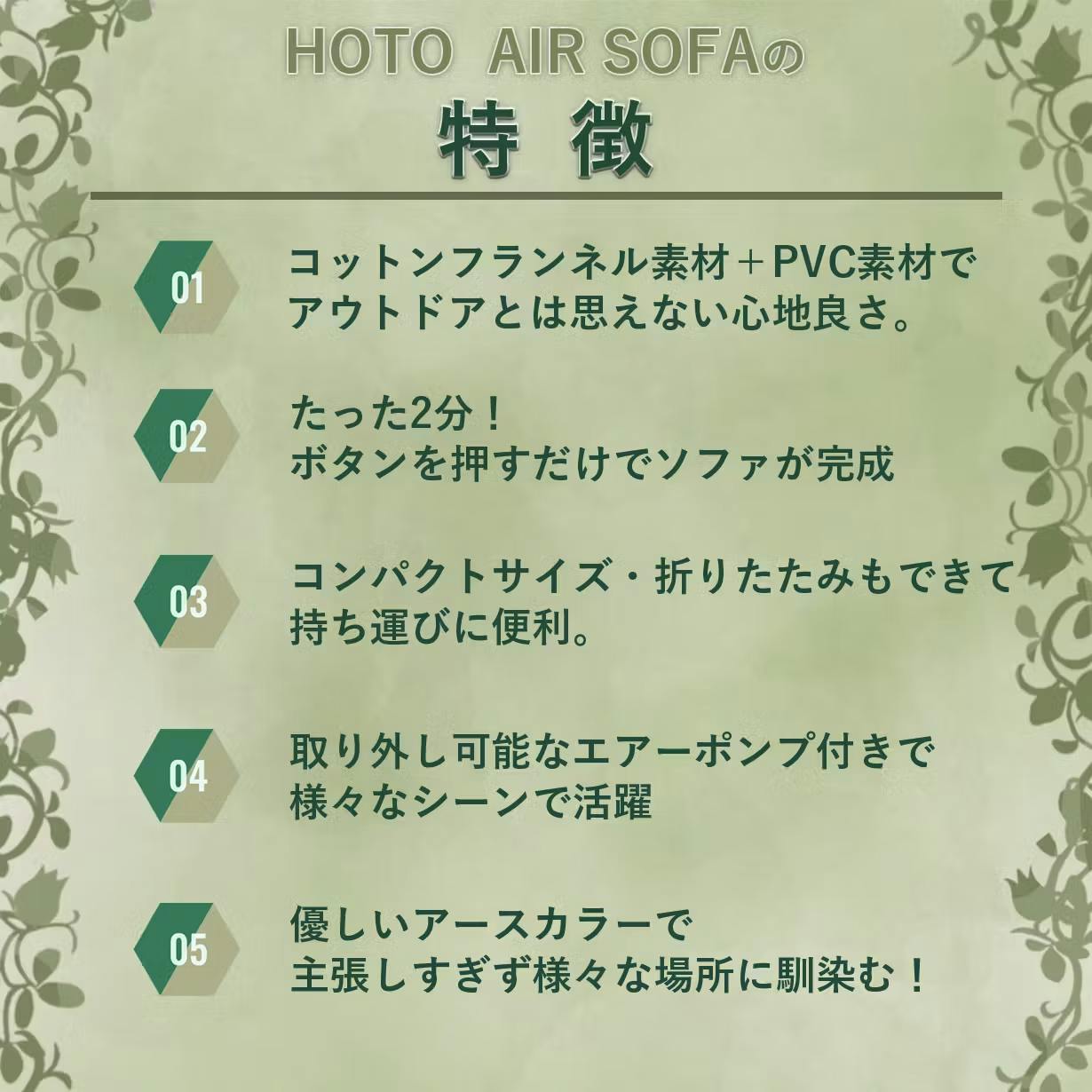 HOTO AIR SOFAの生地は、防水加工を施した高級素材のコットンフランネル、寒さで表面のひび割れを防ぐPVC素材を使用しています。