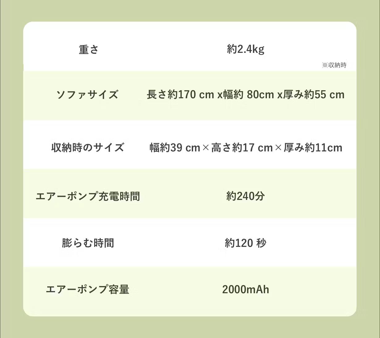 ボタン1つで自動的に空気の出入れが可能。2000mAhの大容量バッテリーのエアーポンプを搭載しており、わずか120秒でソファーに空気を入れることができます。
