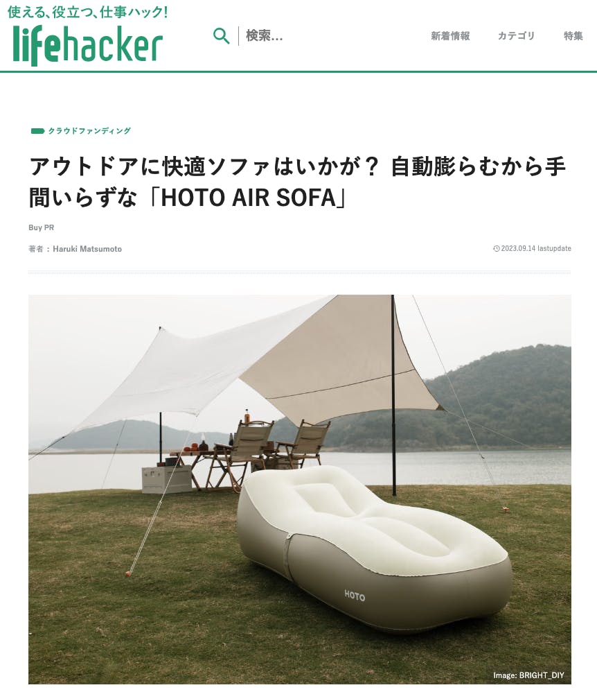皆様、こんにちは!Brightチームです。お世話になっております。8月19日、Lifehackerで「HOTO AIR SOFA」を紹介して頂きました!話題:コットン生地で寝心地もいいね! 自動で膨らむお手軽エアマット「HOTO AIR SOFA」是非下記のリンクからアクセスしてみてください。https://www.lifehacker.jp/article/machi-ya-hotoairsofa-review-682073/【レビューの一部抜粋】〈表面素材はパジャマやシャツなどにも採用されるコットンフランネル生地。 肌触りや保温性に優れ、サラッとした触り心地。ビニール製のものと比べると格段に寝心地が良いですね!アウトドアに助かる防水加工が施されているのも助かるポイントです。〉興味がある方、是非ご支援よろしくお願い致します。https://camp-fire.jp/projects/view/702777Brightチームは、当プロジェクトをもっと多くの方に知っていただきたいと考えております。よかったら、FacebookやTwitter等のSNSでのシェア・拡散をお願い致します。#brightdiyどうぞよろしくお願い致します。Brightチーム