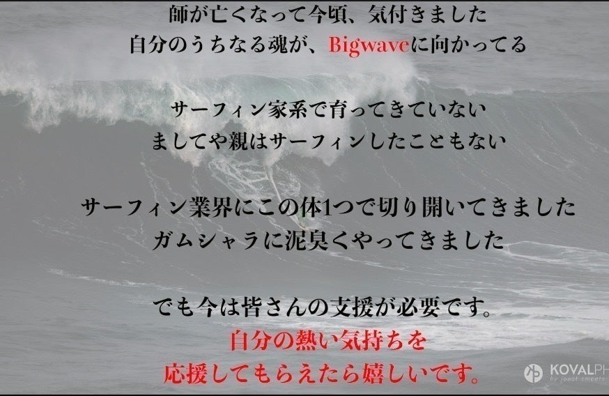 サーフィンのBigwaveというジャンルに魅了され、日本はもちろん海外のBigwaveに挑戦するという活動を行なっております。