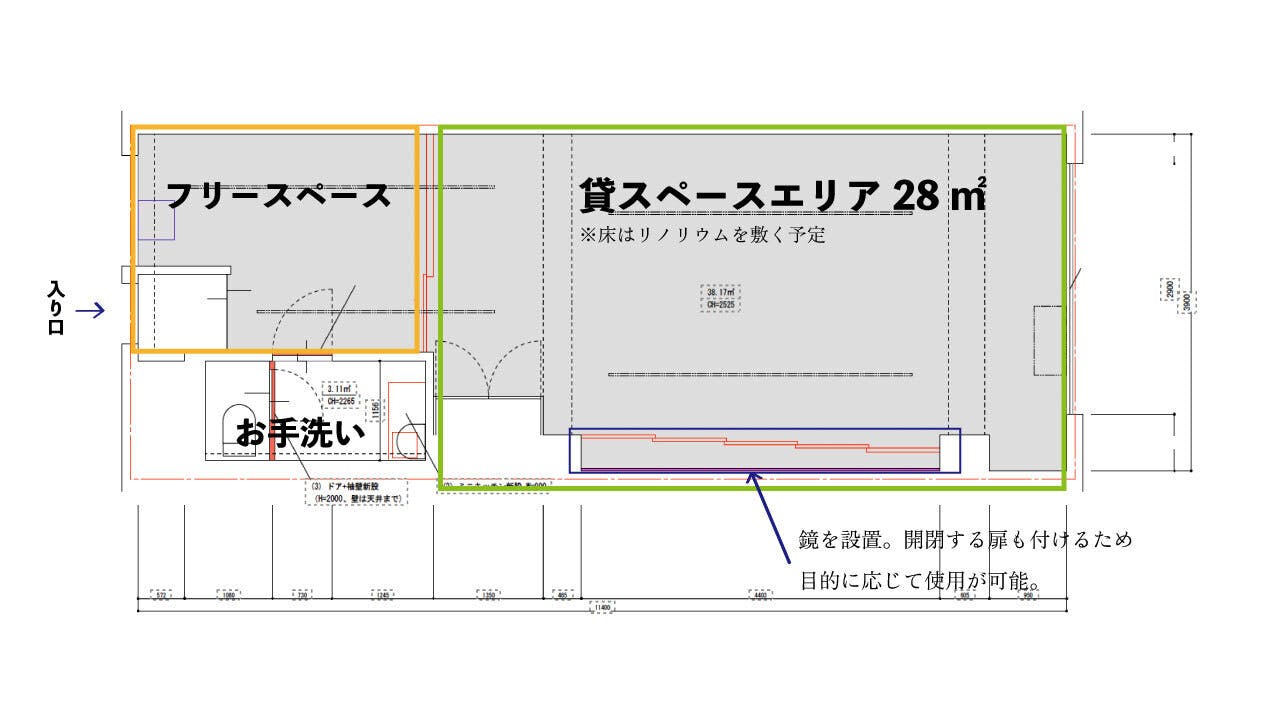 ▼物件の図面です(貸スペースとして利用できるエリアは28㎡のため、割と広いです)