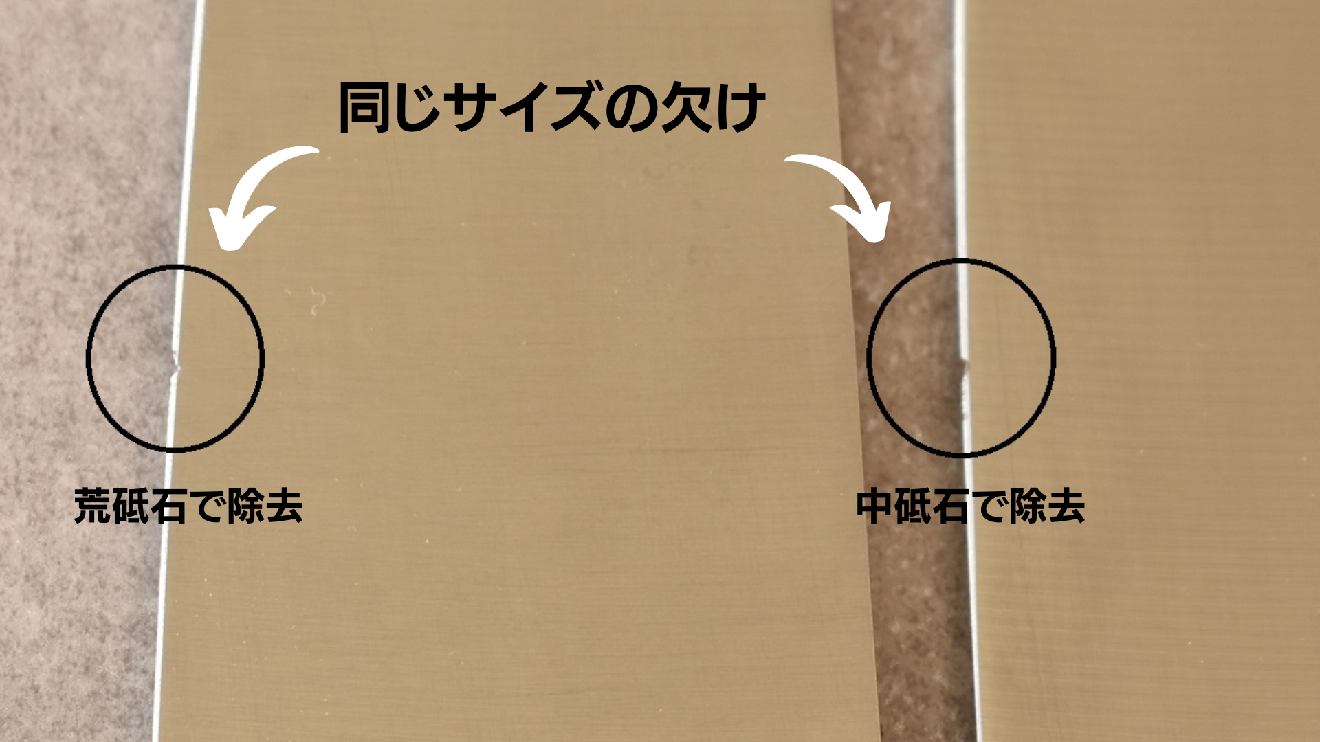 荒砥石の重要性を説明する為に、全く同じ種類の欠けた包丁2本を用意して実験を行いました。