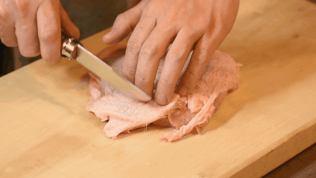 ナイフで鶏肉が皮ごと一発で切れます!
