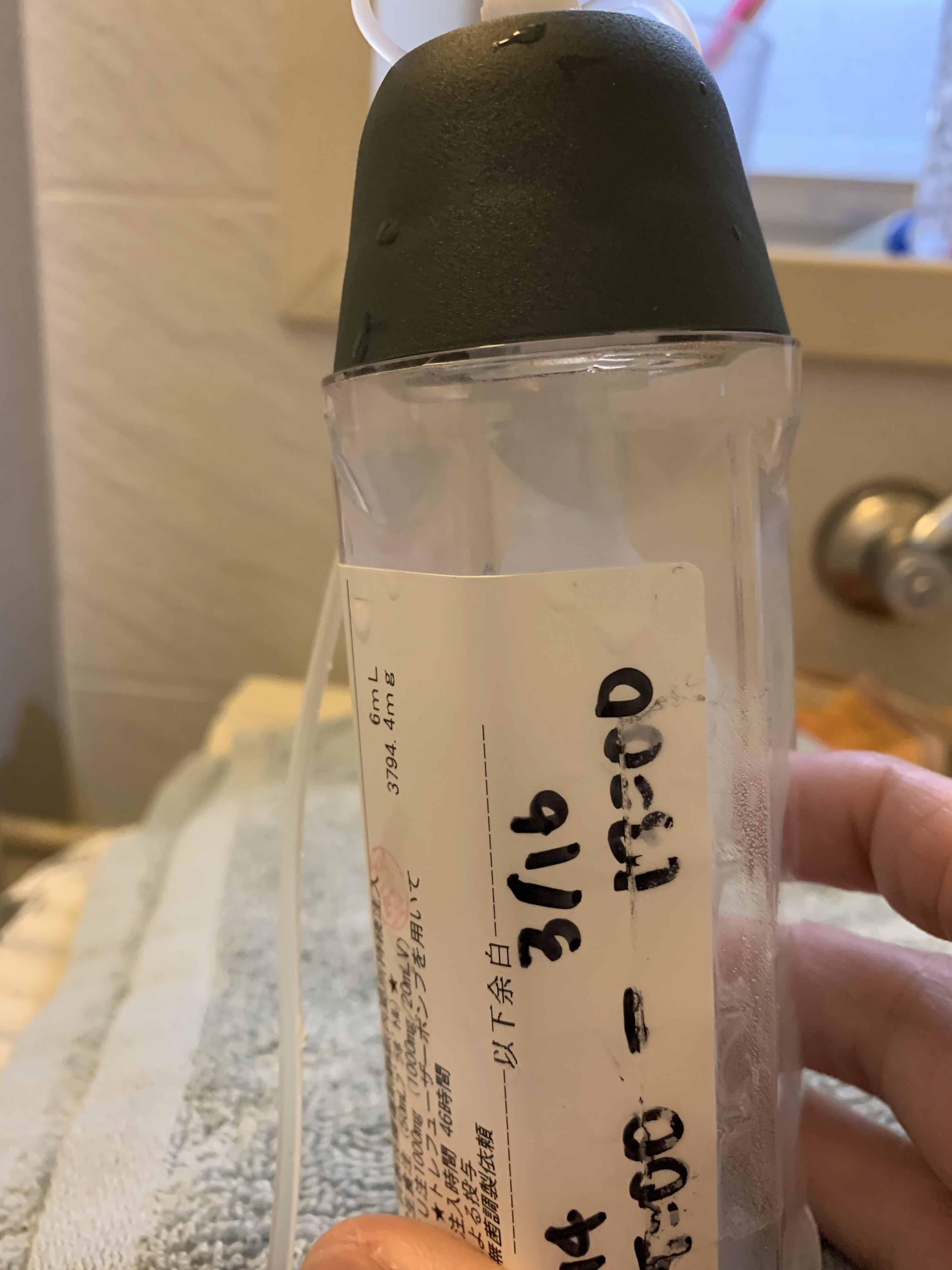 こんな哺乳瓶みたいなのを胸のパワーポート(胸に埋め込む点滴のシステムで、それが心臓。に刺さっています。中心静脈点滴をしなくても、ポートから濃い点滴を受けることができます。)
