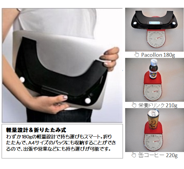 ノートパソコン移動スタンド Pacollon(パコロン) は180グラムとスマホ並みに軽く、2つ折りすればA4サイズにすっぽり収まるので、ノートパソコンと一緒に商談や会議の席に持ち運べます。パソコン画面をサッと回転させて相手に見せることができるので、会議や商談でのプレゼンの時間が短縮します。さらに、スタンド上面2ヶ所に取り付けられた滑り止め用クッションゴムに付属のゴムキャップを被せれば、キーボードが傾くことで、操作性が向上します。また、パソコン内蔵のWEBカメラ位置が目の高さまで上がり、カメラ映りが良くなります。
