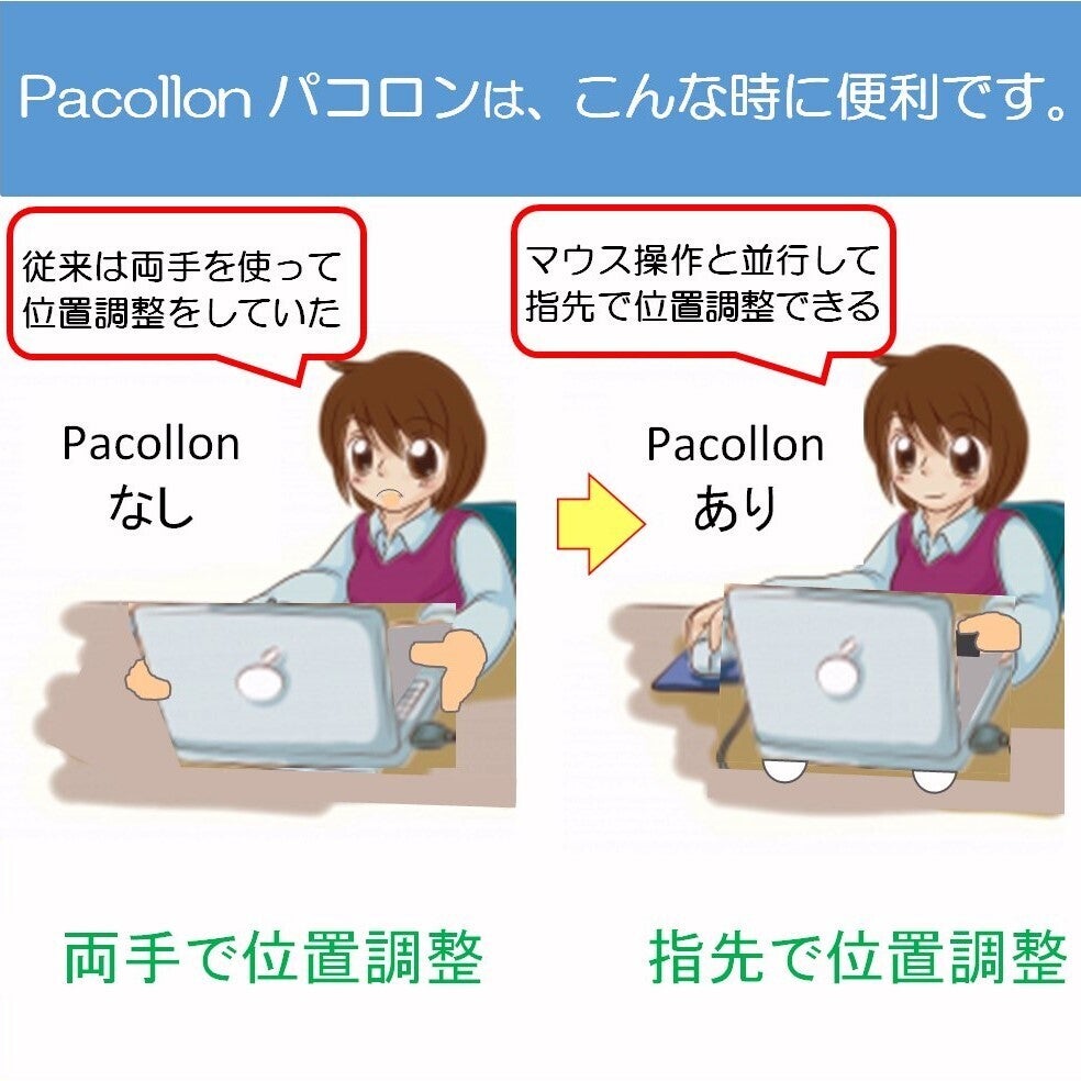 ノートパソコンに向かい仕事をする際、両手でパソコンの位置を動かすのが面倒と感じたことはありませんか。指先で素早くノートパソコンを移動し位置を調整できるのが、「パソコン移動スタンドPacollon(パコロン)」です。発売10周年記念として、樹脂製ベアリング採用により水洗いできる新モデルを製作しました。