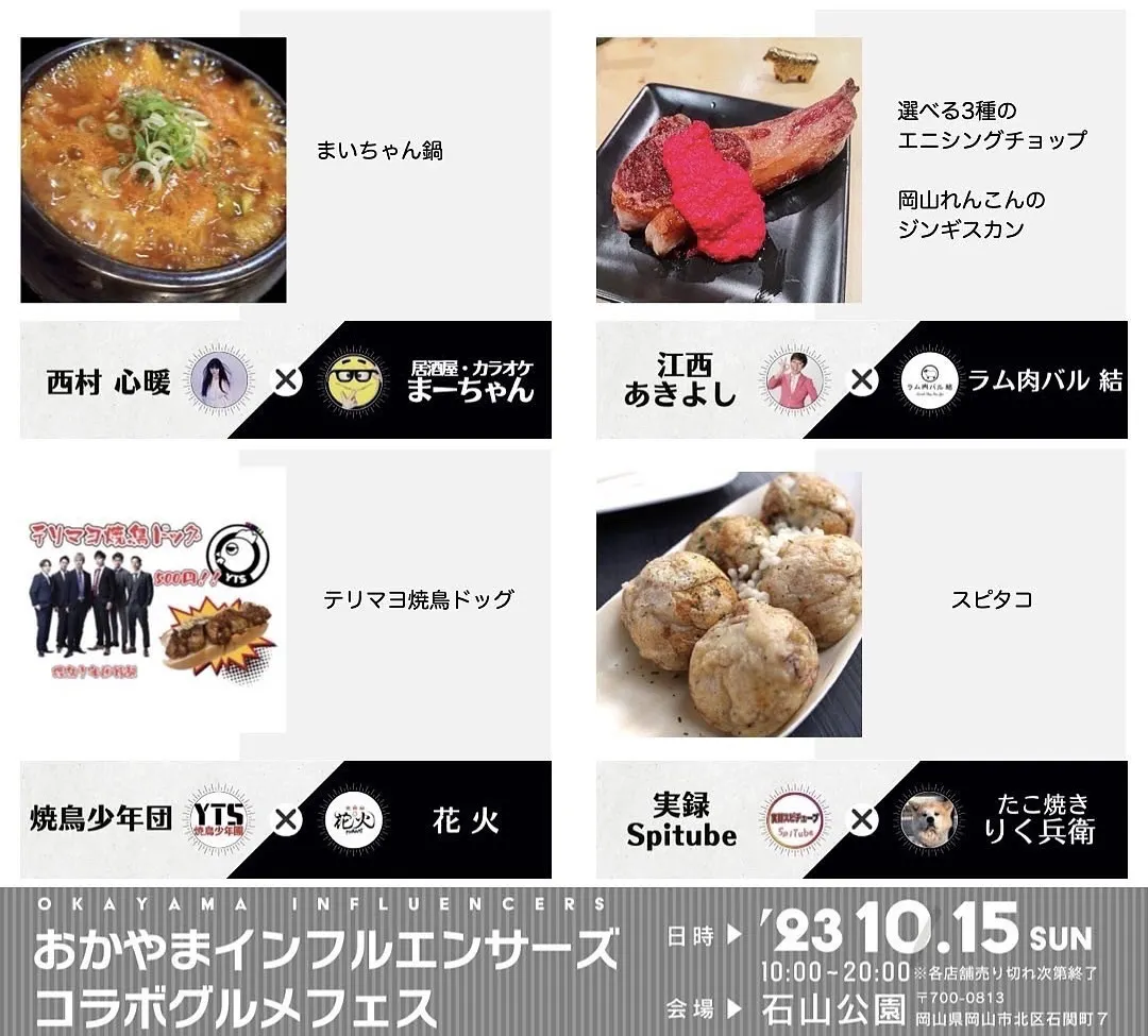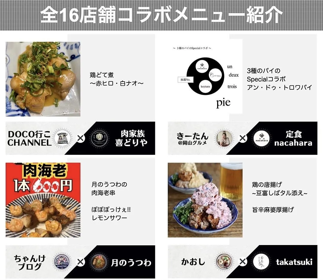 総勢16組の「おかやまインフルエンサーズ」のメンバーが、それぞれが推しの飲食店とコラボをして、イベント限定メニューをプロデュースして皆様に楽しんでもらうグルメイベントです。
