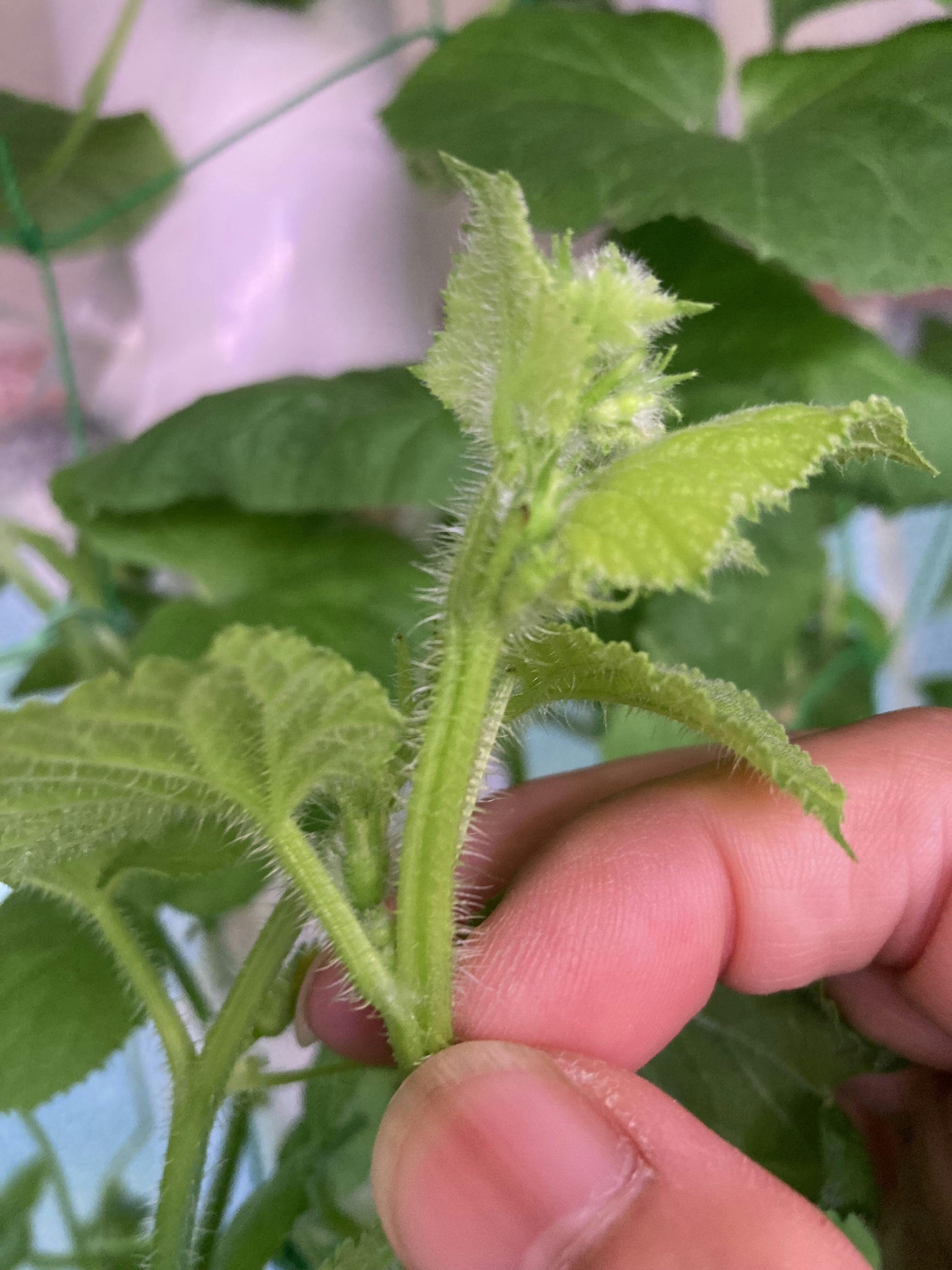 最終日には雌花の開花が見られるかと思いましたが、今朝の段階ではまだ開花はもう少し先のようです。写真のちょうど指にかかる箇所が雌花となり、果実へと成長していきます。