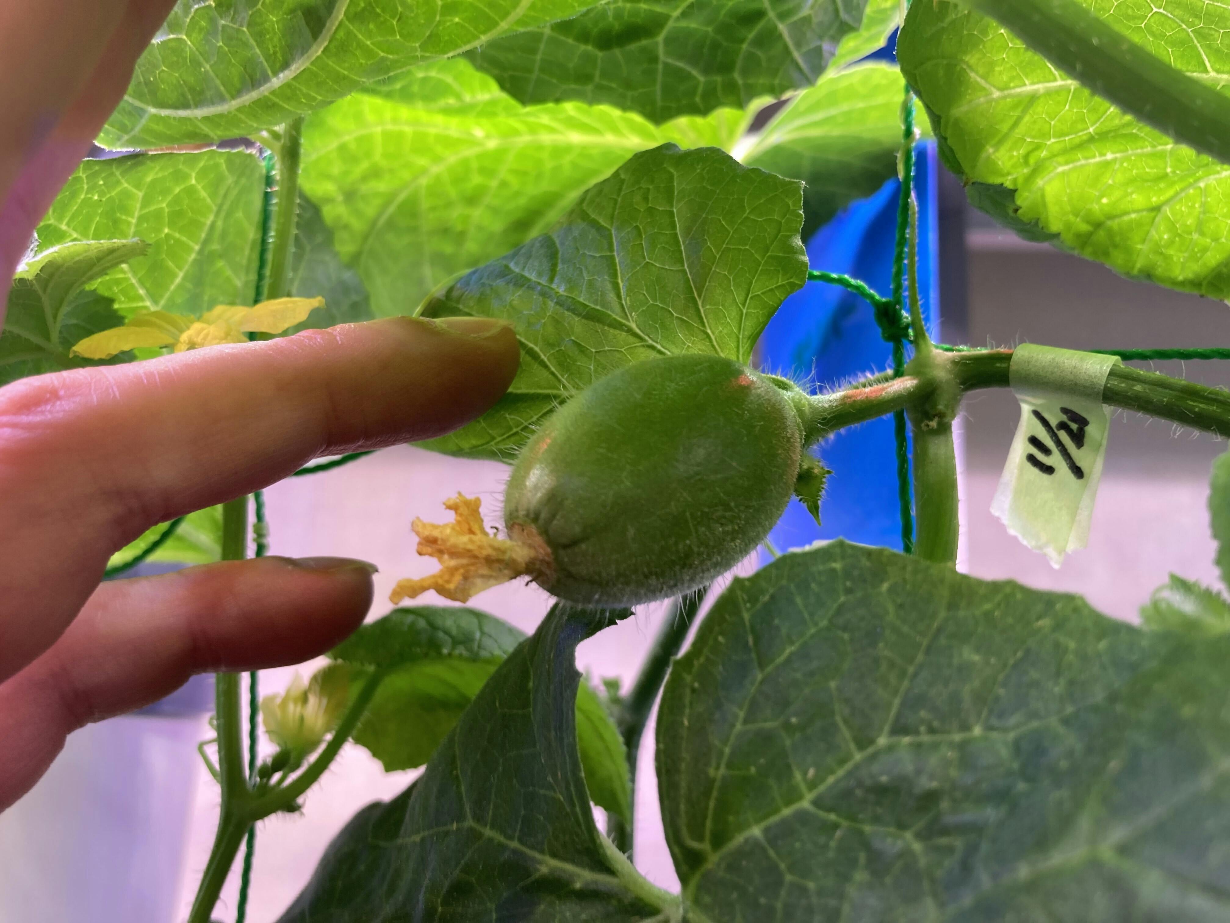 害虫被害で50%枯れてのリスタートになってしまいましたが、無事に子房が大きくなり始め、人工授粉に成功した実があちこちに見えだしました。まだ産毛があり、触れると後のネット模様に傷がついてしまいます為、日々慎重に授粉作業を進めております。