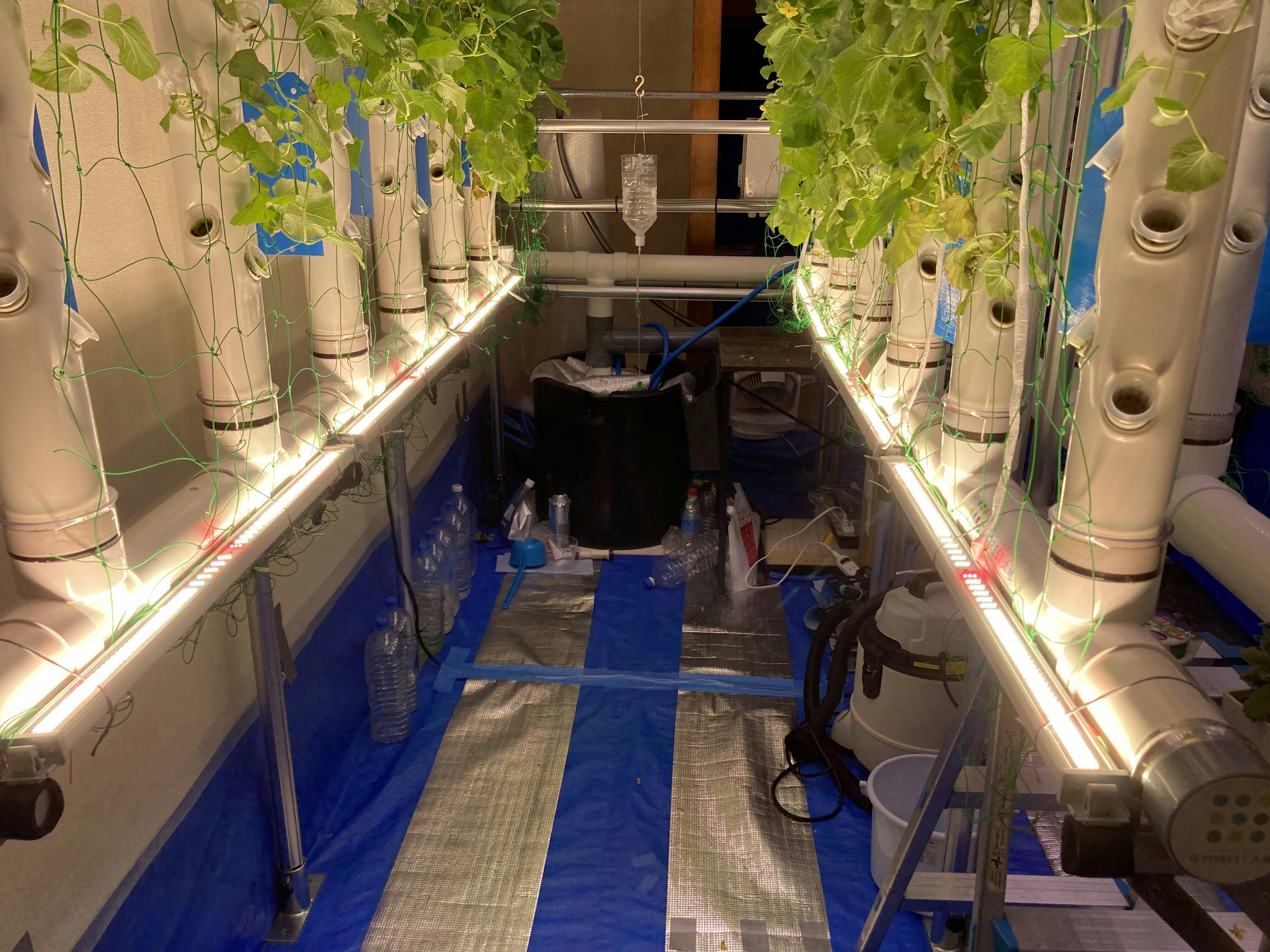 また、スリップスが朝方、葉裏へ産卵するという性質があるため、朝方のみ下からLEDで照らし方向感覚を麻痺させる実験を行なっております。