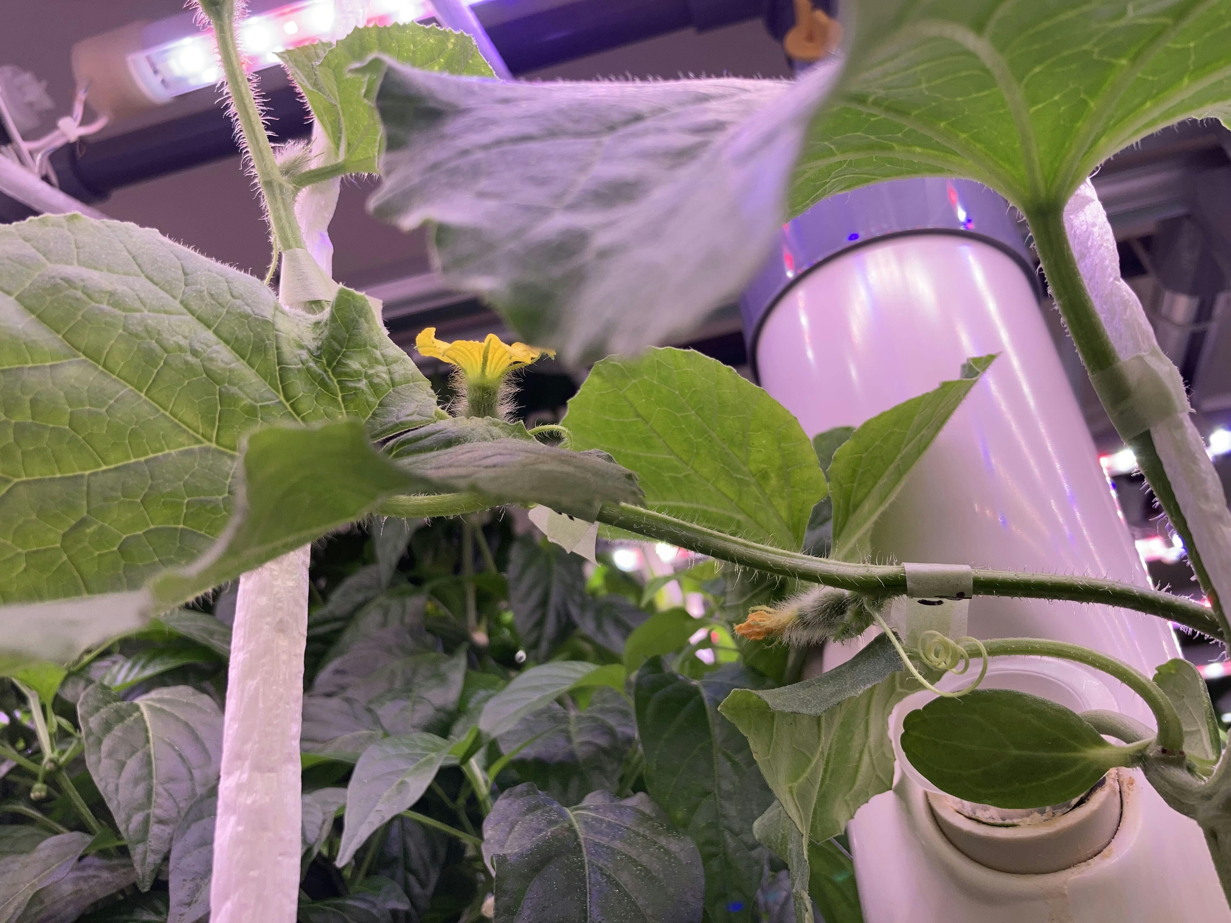 再開いたしました縦型ユニットのメロンにつきまして、光源に最も近い箇所にありますため、現在子ツル7節目まで成長し雌花をつけ始めております。