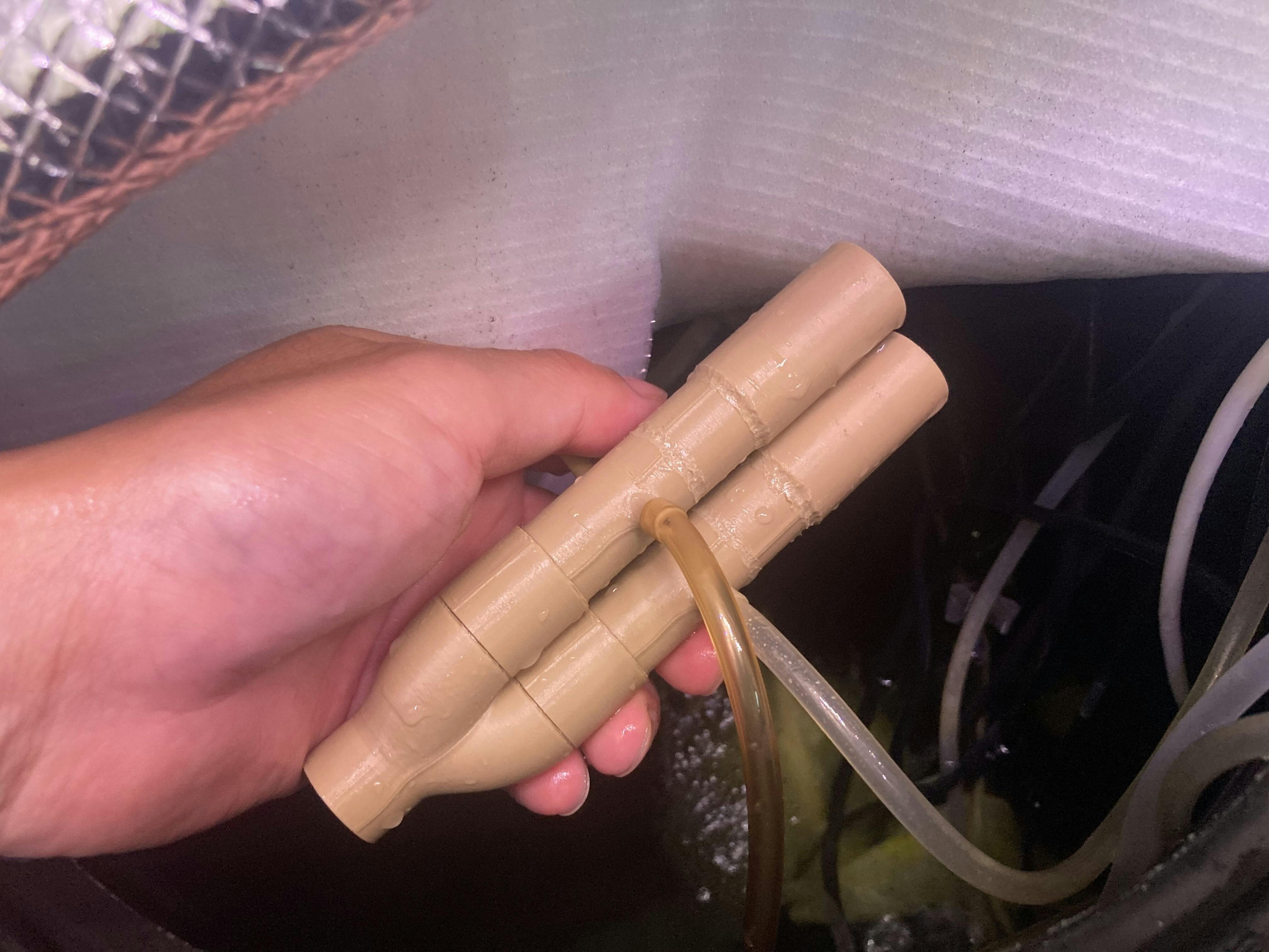 そこで、家庭用の3Dプリンタで作成可能、物理的作用のみで気泡剪断が可能な省電力ナノバブル装置を設計致しました。材料費100円ほどで作成可能で、将来的に東根全体でメロン生産を行う際の一助になればと考えております。