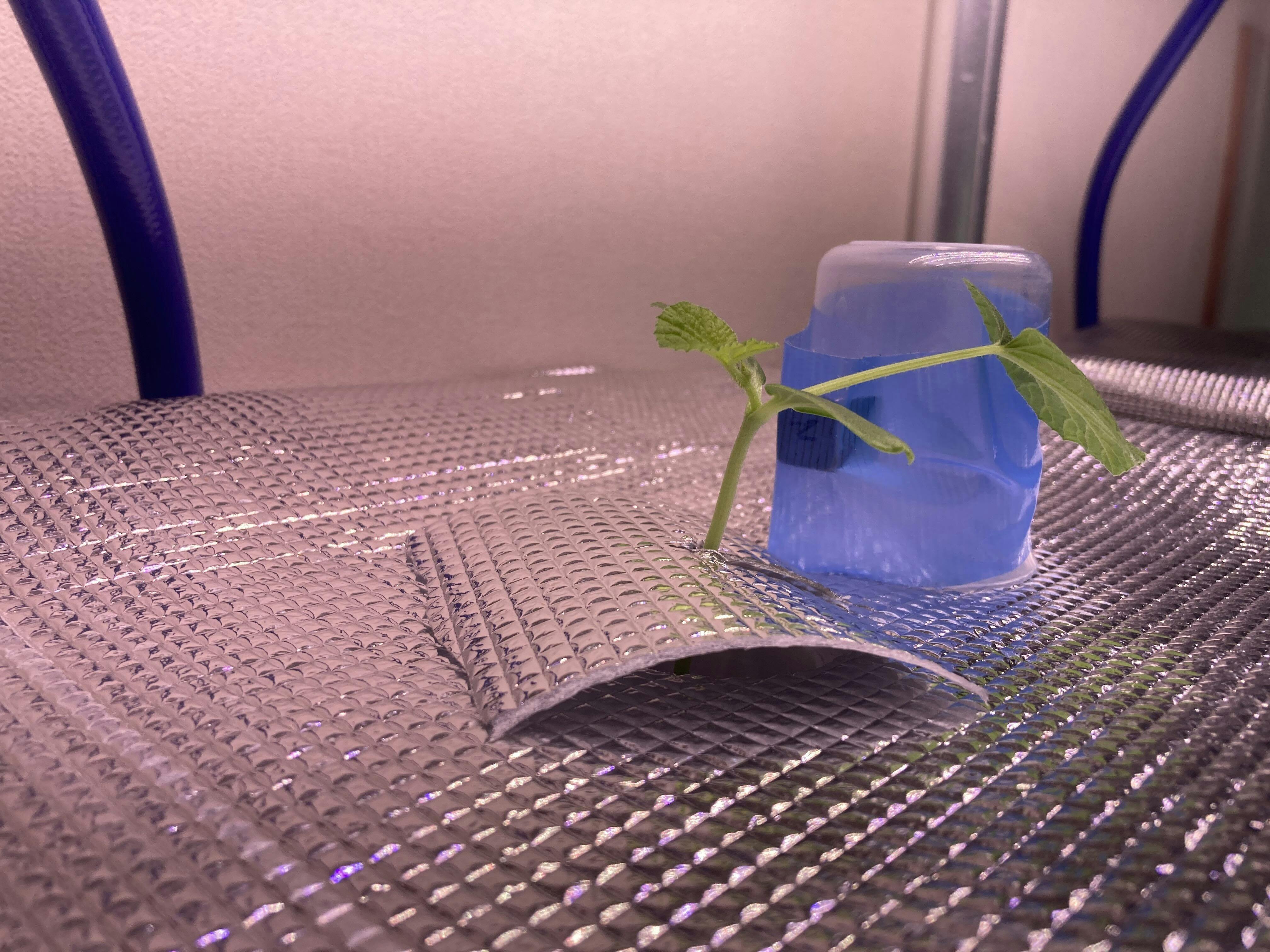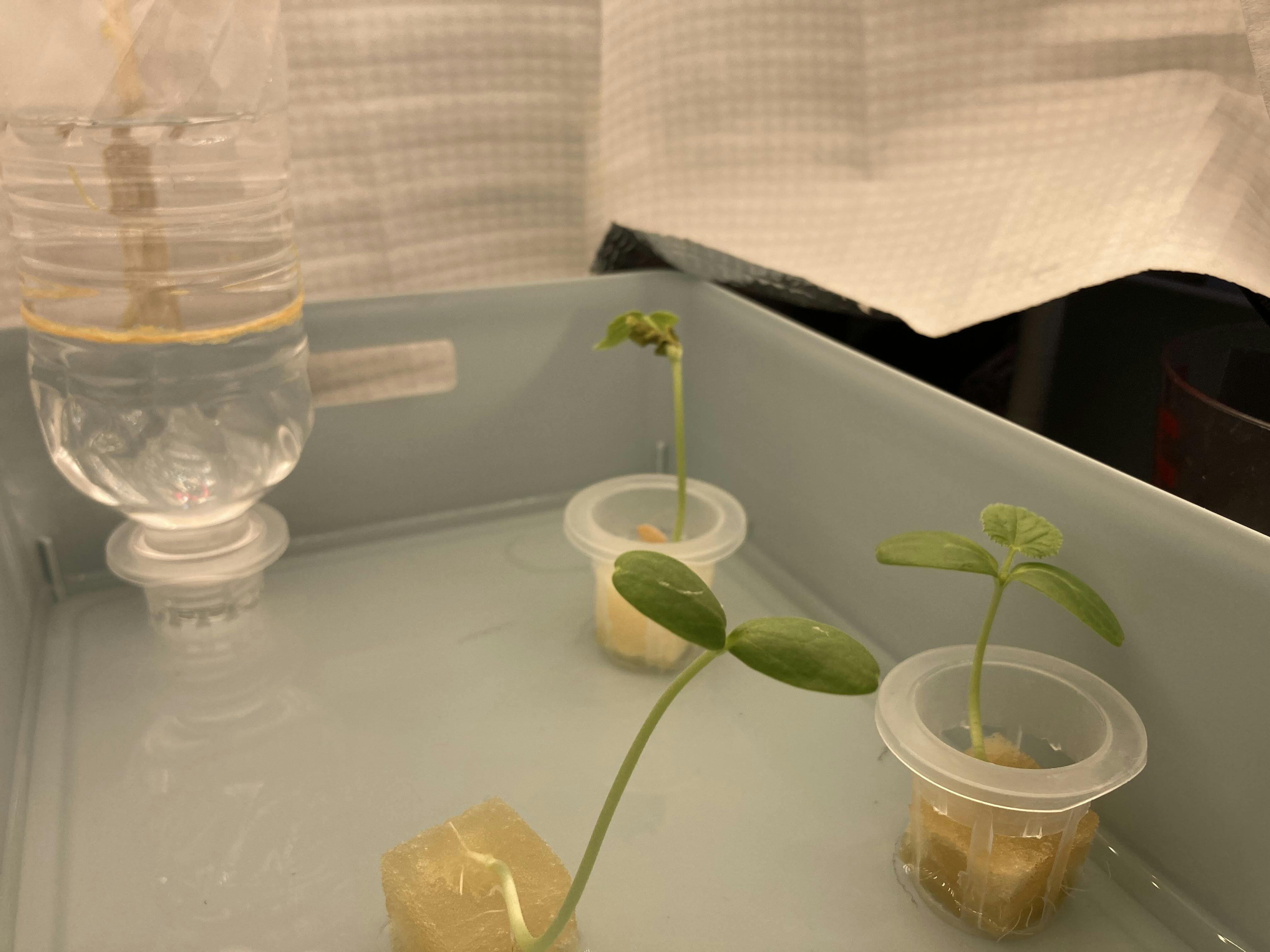 発芽の際のみ磁場を与えたものと、一番手前が磁場を与え続けたもので、成長に差が生まれました。ある程度の効果はあるようですが、茎根の成長は通常の環境と比較しますと弱々しいようです。