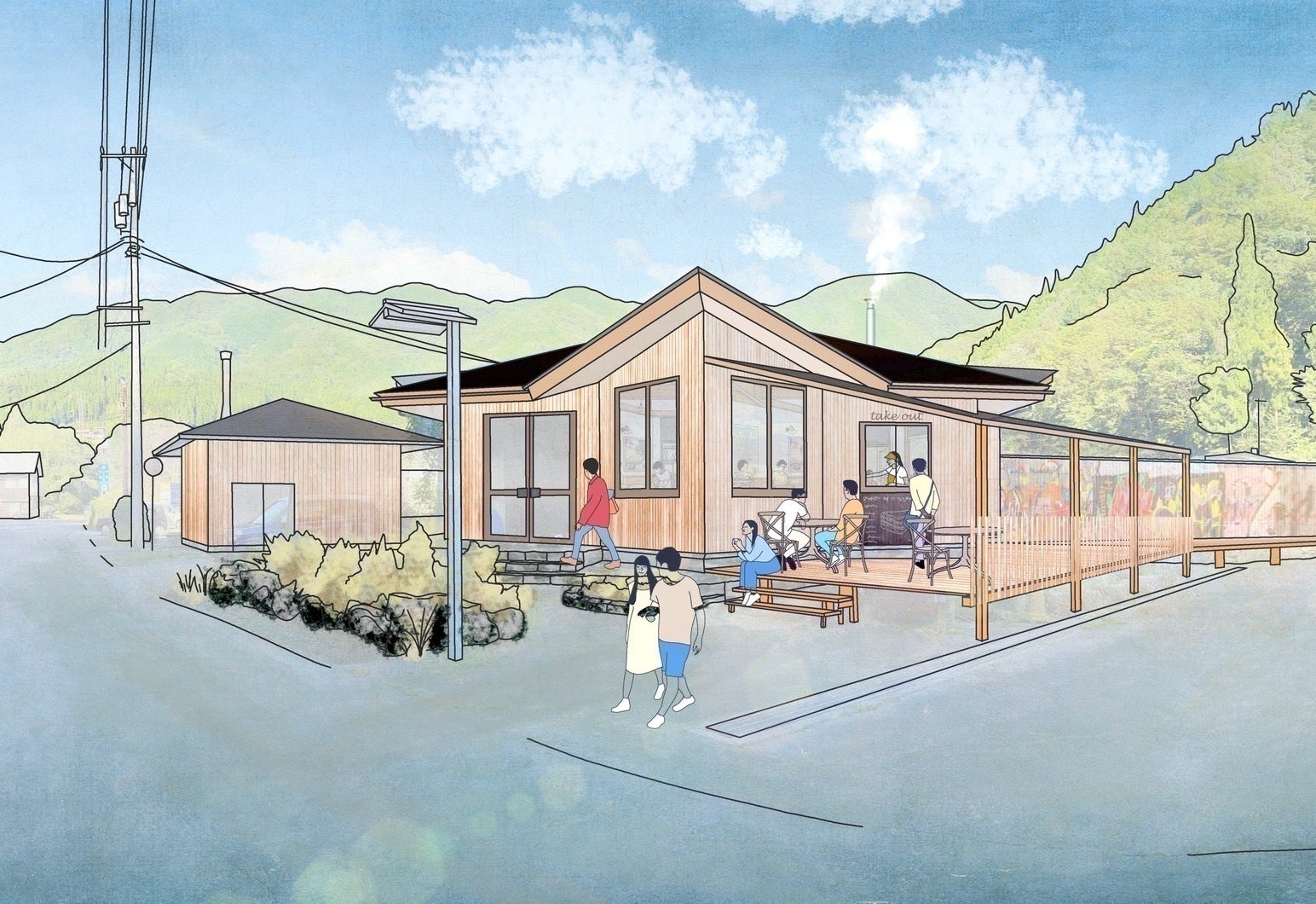 アクティビティ体験者や観光客向けに、テイクアウト可能な軽食(ホットサンドイッチ、フライドポテトなど)を提供します。外には馬瀬川を眺めながら食事ができるテラス席を用意しています。アウトドアアクティビティを楽しんだ後、軽食を味わいながらくつろぎのひとときを提供します。