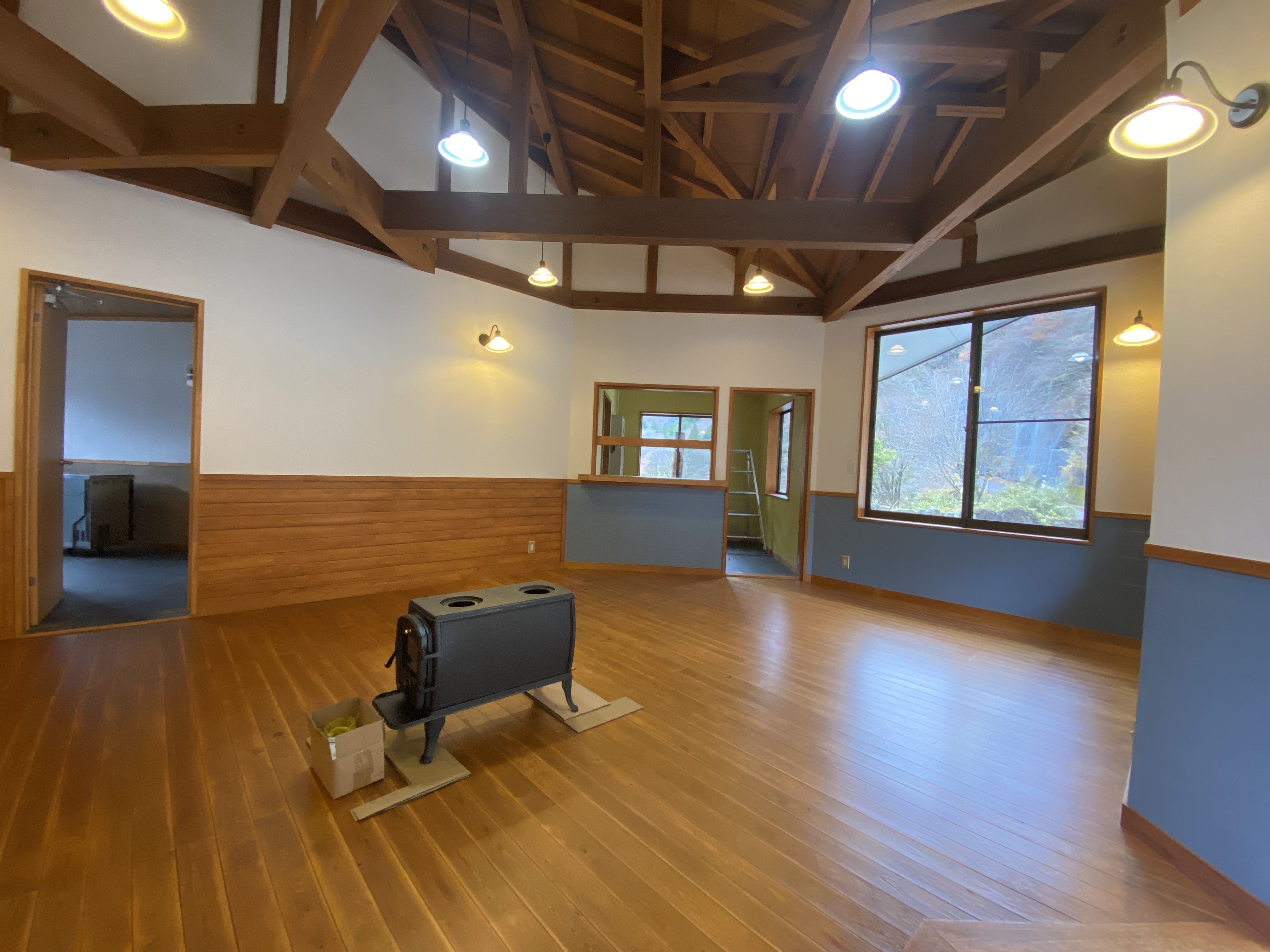 地道にやすりがけして古い塗装を剥がし、上からニスを何度か塗り綺麗に丈夫にしました。壁には外壁よりも少し暗めにしたブルーグレーを塗りました。