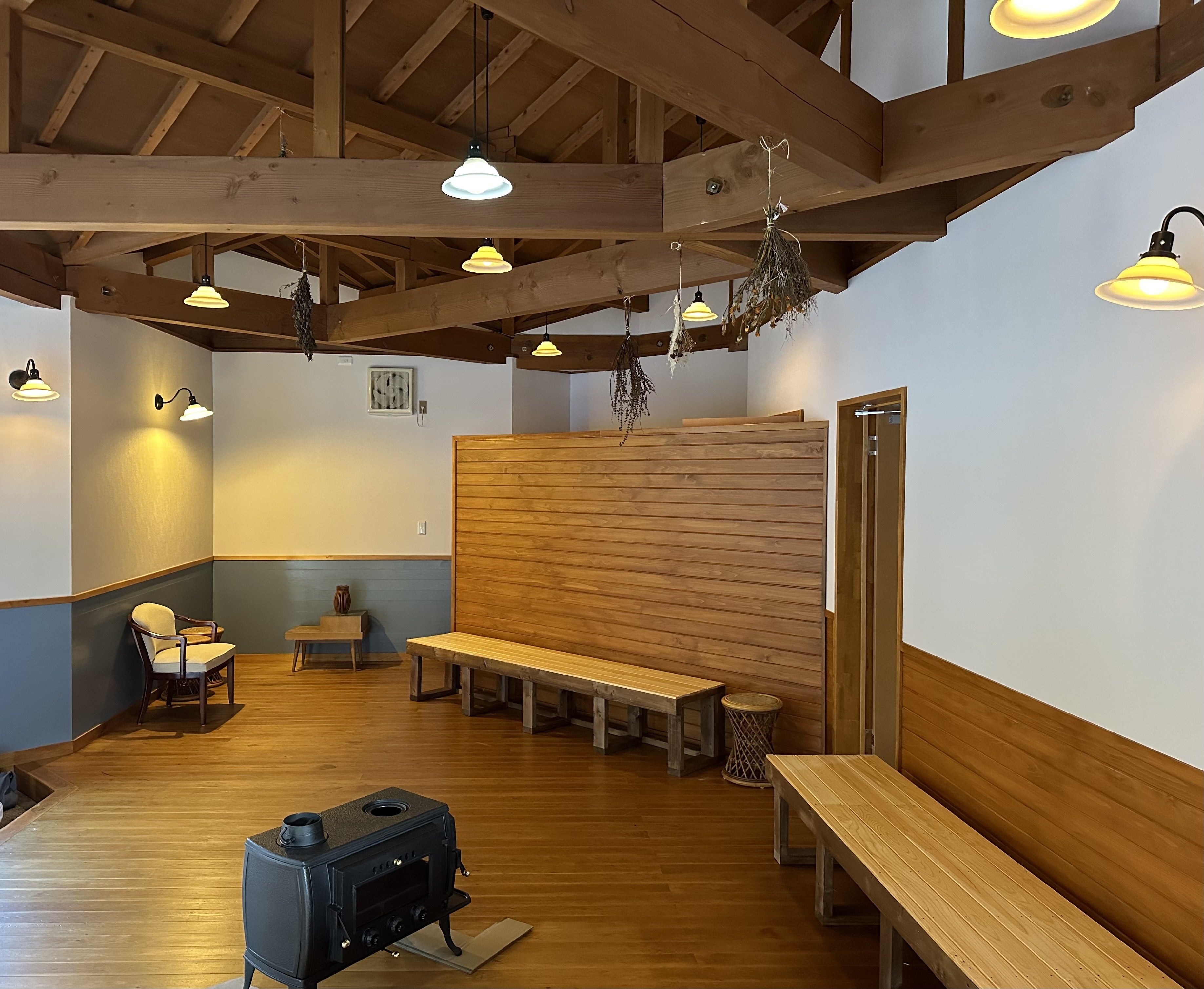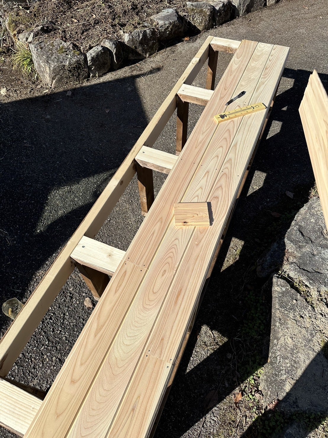 壁づたいにベンチを並べ、テーブルを前に置くイメージで作りました。頑丈に作る