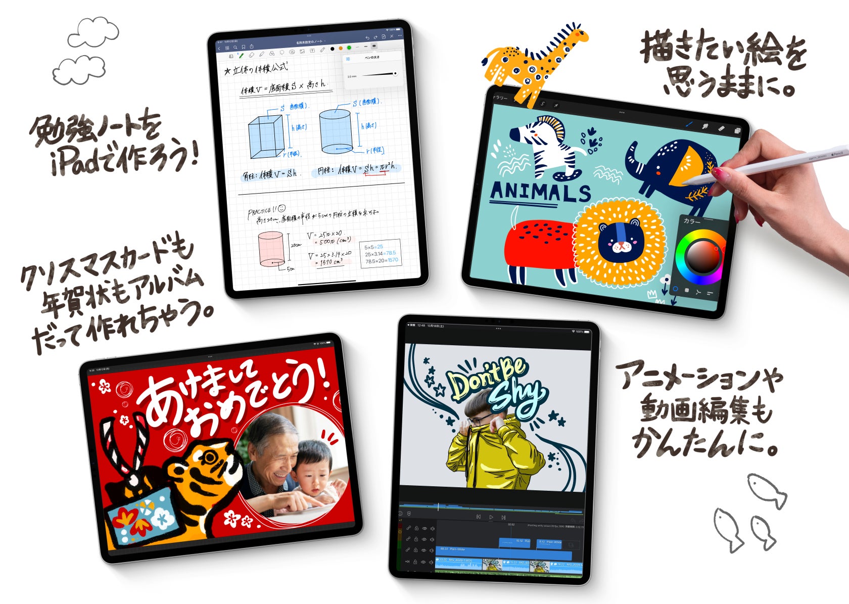 iPadを使えば、イラストやノート作り、 動画編集、アニメーション、3Dまで いろんなクリエイティブワークを体験できます。