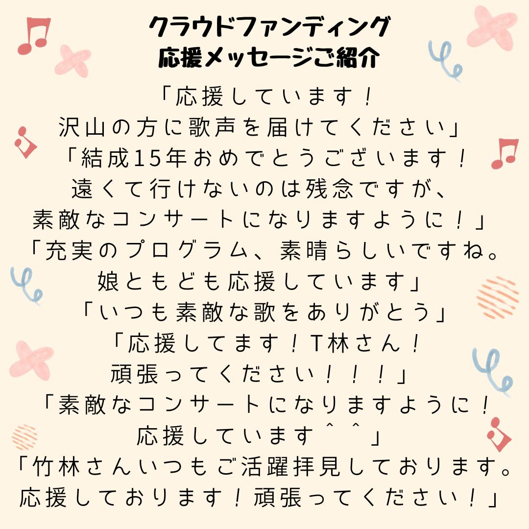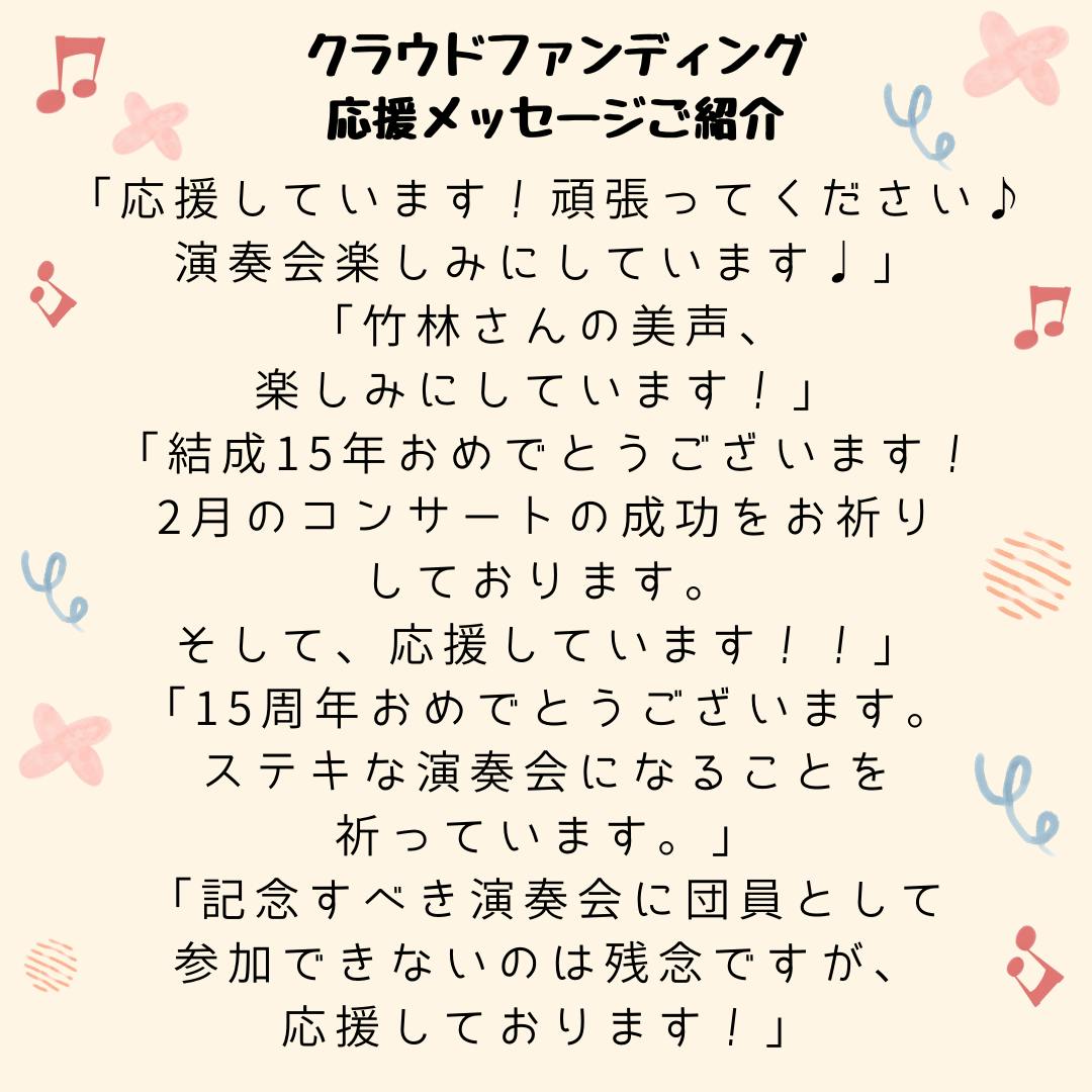 おかげさまで70名を超える皆様からご支援をいただくことができました。本当にありがとうございます。演奏会を楽しみにしていただいているというお声や、これからも続けてくださいといった皆様からの温かく心のこもったメッセージは、私たちの活動の大きな励みとなっております。いただいたご支援を無駄にせぬよう、当日までしっかりと準備を進めてまいります。