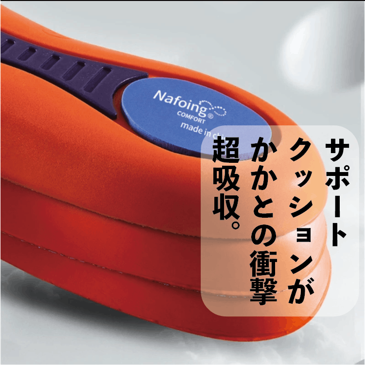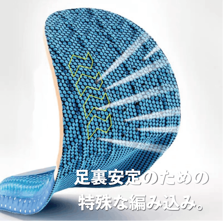 超衝撃吸収パッドが足にかかる衝撃を吸収しつつ、土踏まずマッサージクッションが、土踏まずを上に押し上げます。