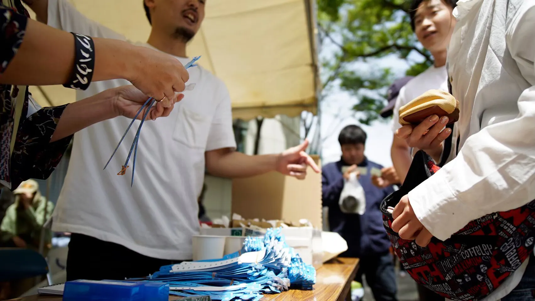 //人手が足りず実行委員長自らリストバンド交換をする様子//