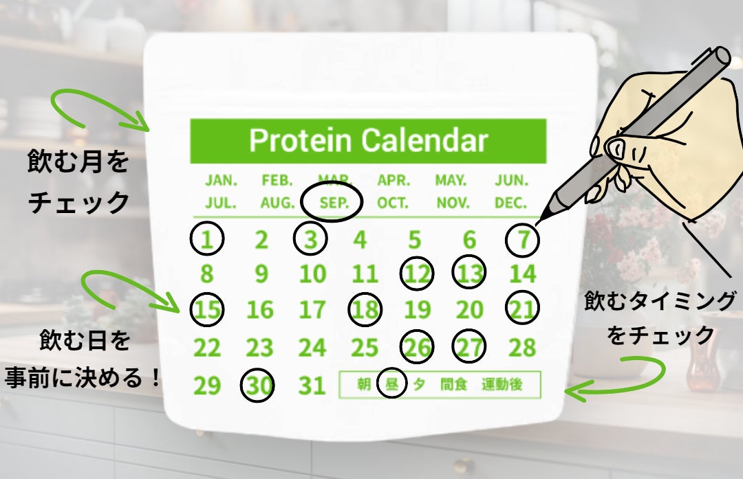 1袋当たり約11日分のプロテインが入っているので、カレンダーには11日分、日付に〇をつけてください。