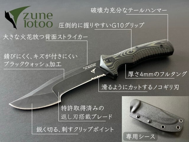 そんなブッシュクラフトでの多様なシーンを想定して作られた『ZUNE LOTOO ZANDA』アウトドアナイフは、タフで使いやすく、8つの役割を一本でこなす新しいブッシュクラフトナイフ。