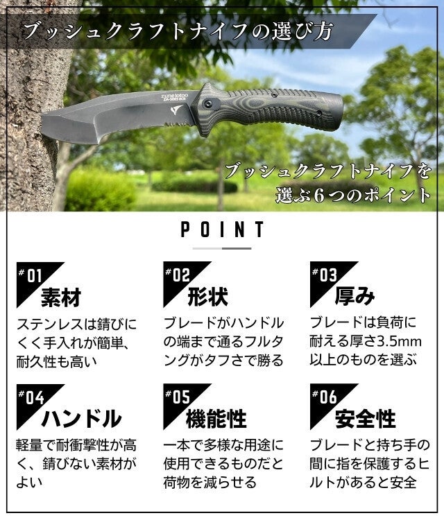 十分な耐久性、握りやすいグリップ、8つの役割がひとつになった使い勝手など、様々なアウトドアナイフの良さを集結させた完成度の高いブッシュクラフトナイフです。