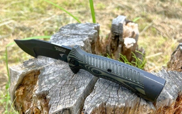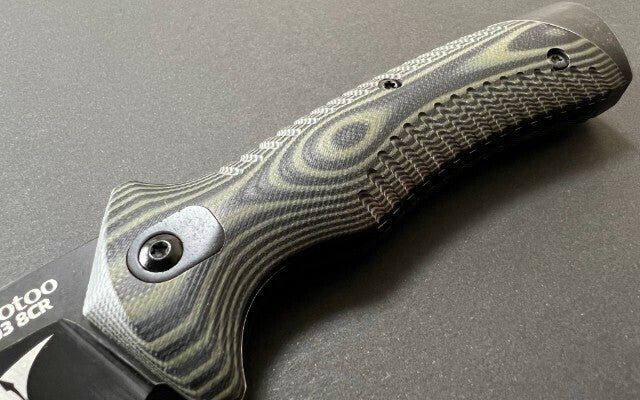 ハンドルには近年ナイフ用ハンドル素材として人気の高いG10(ガラス繊維入りエポキシ樹脂)素材をチョイス。