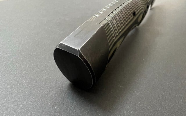 ハンドルのグリップエンドにはハンマーも装備します。ブレードと一体で繋がったフルタング構造のテールハンマーは頑強。