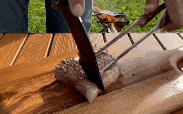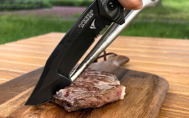 鋭いクリップポイントで厚い肉もすべるように切れる。