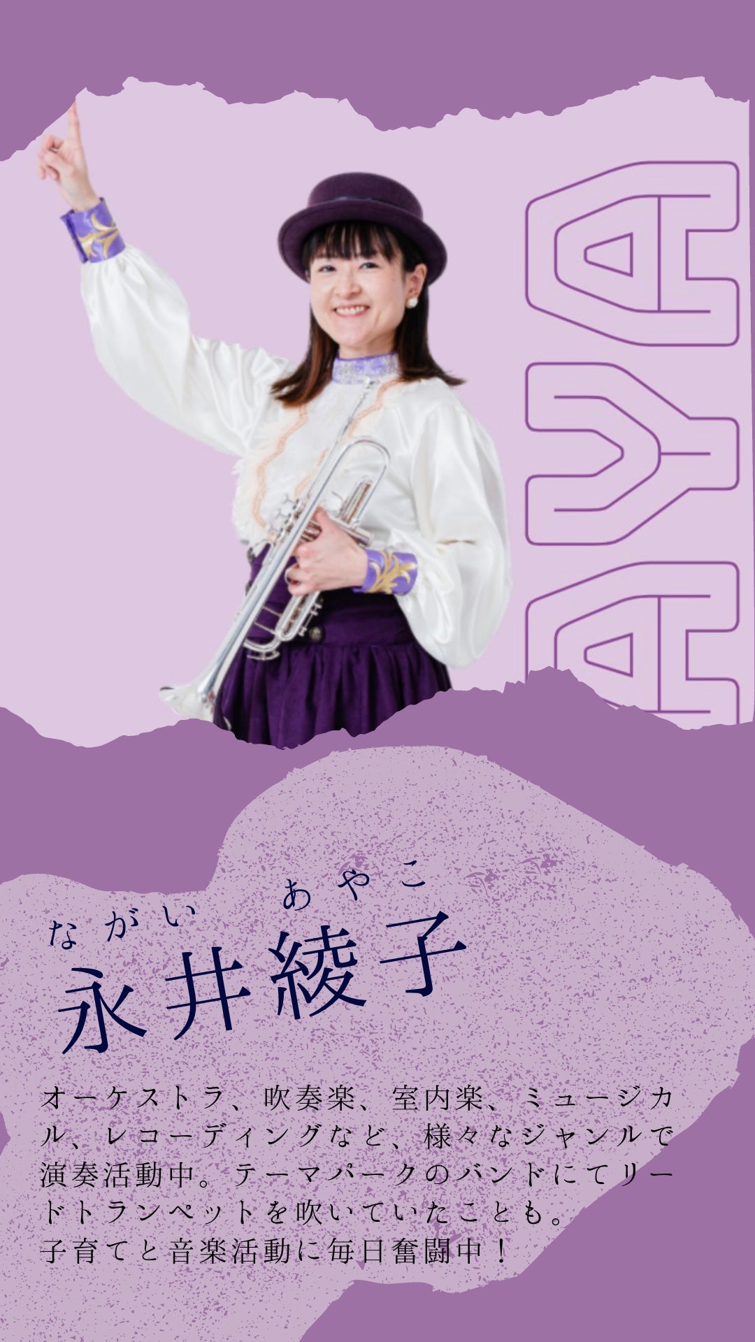 トランペット奏者であり、2児のママであり、家族と音楽が大好き。日々楽器を吹いたり、教えたり、子育てしたりと活動をしています。コロナ禍も経て、苦しい思いも沢山しました。「音楽は必要か?必要でないか?」と究極のところまで考える日々でした。ですがなんとか世間も落ち着き、たくさんの方々に援助をしていただいて乗り越える兆しが見えてきています。今回もまた新たな目標に立ち向かおうとしています。