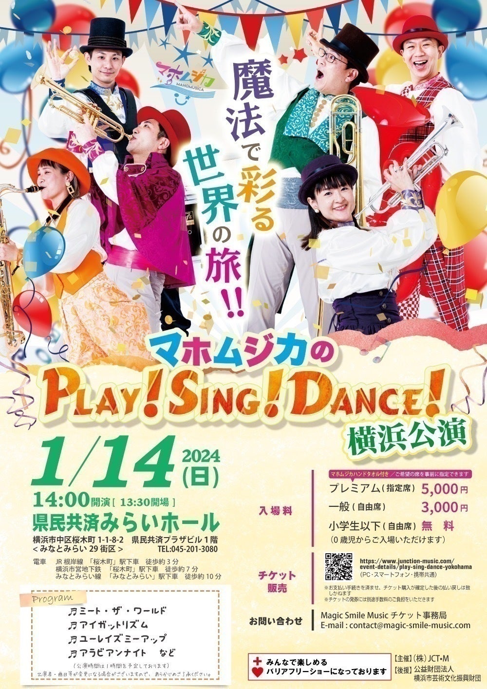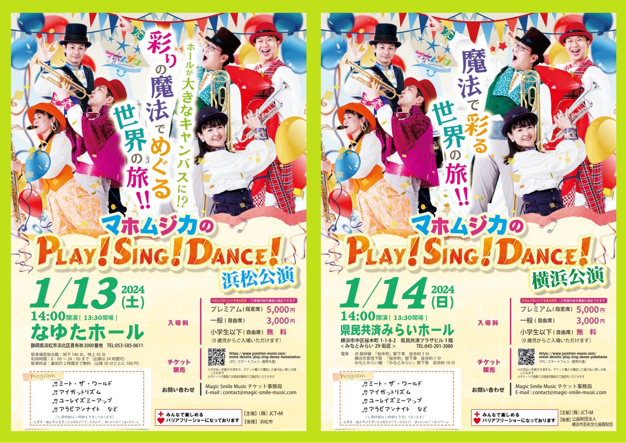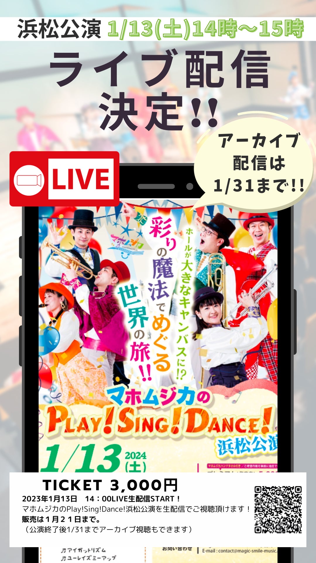 2024/01/04 15:55✩˖°⌖.꙳✩˖°⌖2024年✩˖°⌖.꙳✩˖°⌖.꙳✩あけましておめでとうございますクラウドファンディング応援ありがとうございましたおかげさまでsuccessすることができました‼心から感謝いたします ✩˖°⌖.꙳✩˖°⌖.꙳✩˖°⌖.꙳✩˖°⌖.꙳✩そして、能登半島地震にて被害に遭われた皆様に謹んでお見舞いを申し上げます。浜松公演、配信チケット販売が決定致しました!販売サイトはこちら能登半島地震の被災地の方へ、少しでも音楽が力になればと思い、石川・富山・福井の3県にお住まいの方には配信を無料でご覧いただけるようにいたします。メールにて閲覧方法等のご連絡を致しますので下記までぜひメールを下さい。contact@magic-smile-music.com被災地のお知り合いの方にも是非お伝え頂ければ幸いです。さて、マホムジカの Play! Sing! Dance!浜松、横浜公演まであと10日を切りました!皆様に喜んでいただけるようアクセル全開で参りますので、引き続き応援よろしくお願いいたします! もっと見る