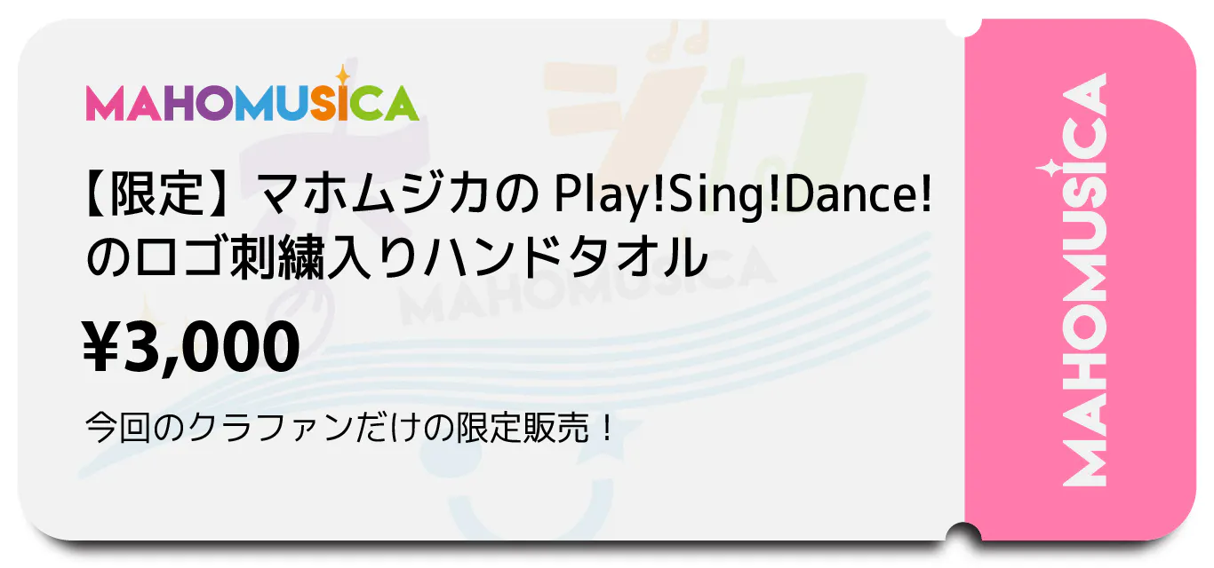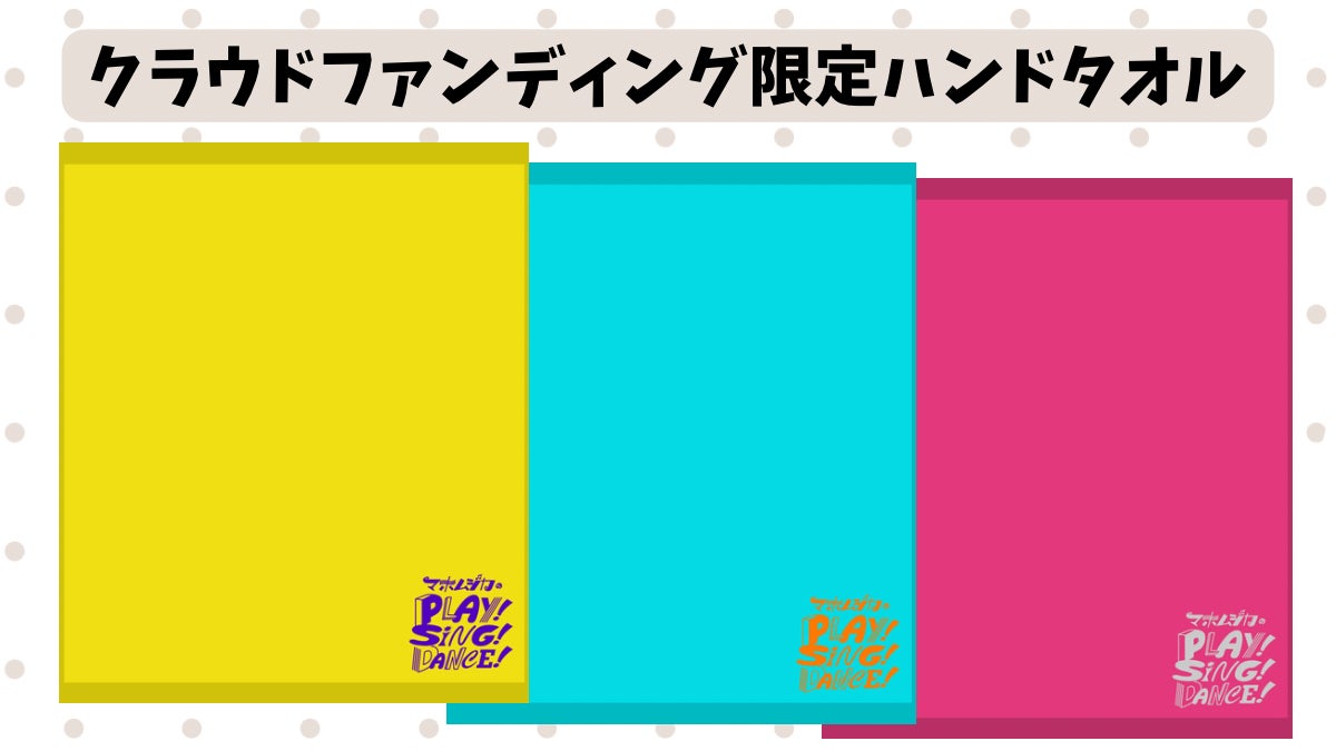 マホムジカの Play! Sing! Dance!のロゴを刺繍したハンドタオルです!皆さんの生活のお供にマホムジカが寄り添います。カラーは元気なビタミンカラー3種類!(YUZZYさんチョイス!デザインは入江くん!)