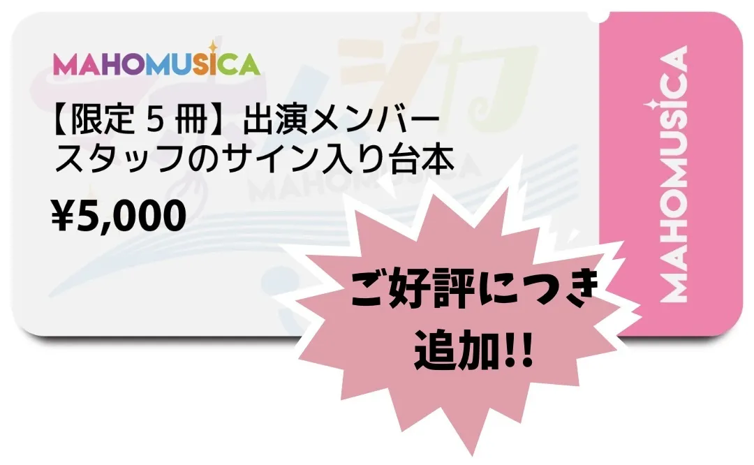 NEWS!:【限定!】出演メンバー、スタッフのサイン入りマホムジカの Play! Sing! Dance!の台本が完売しましたが、ご好評につき増刷いたします!