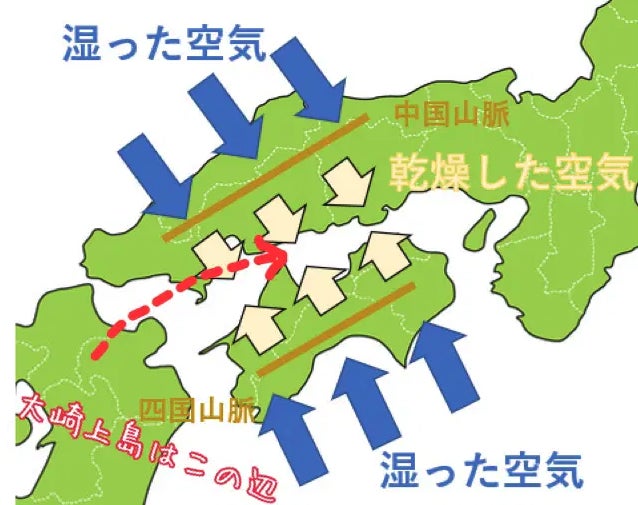 瀬戸内海に位置する大崎上島は上記の図のように、雨は降りにくく温暖な気候が特徴的です。