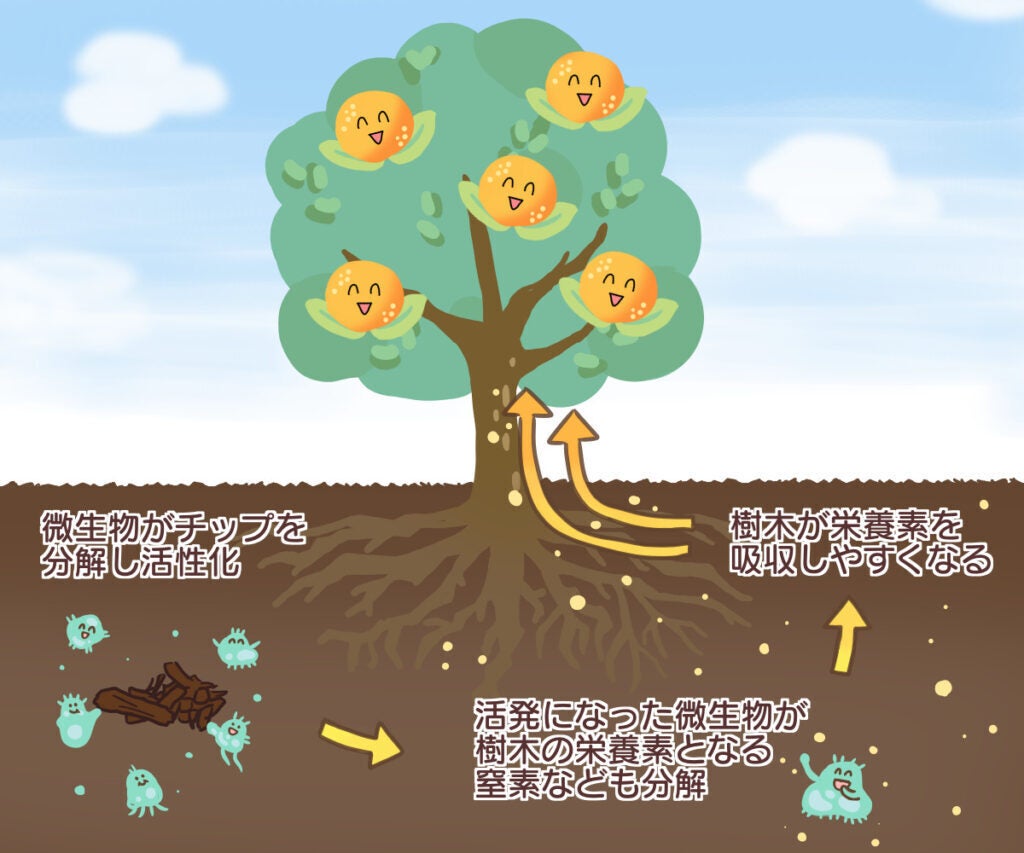 特に他のみかんとの違いとして、大崎上島の柑橘は島の中で取れる木材チップを含めた有機物を使った土を使用する事で、排水性も上がるが保湿性も高い土になります。