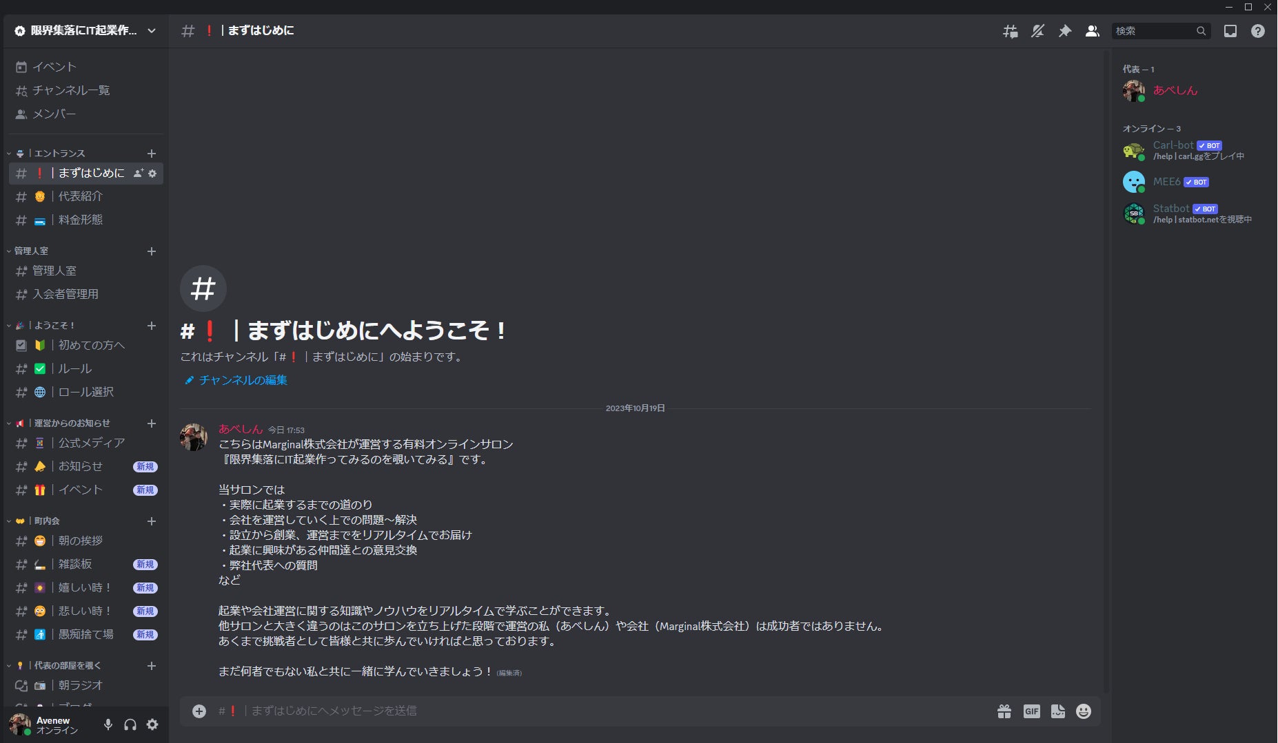 2023/10/19 22:46支援いただいた皆さん。そしてこちらをご覧の皆さん。ありがとうございます。あべしんです。今日は以前リターンが遅くなるかもとお伝えしていたオンラインサロンですが・・・Discordを利用して何とかなりそうです!いやー良かった。オンラインサロンを外注で作ろうかとも考えていたんですが、法人設立前の40万はでかすぎるということでDiscordで自作してます!コンテンツはまだまだこれから増やしていきますが、とりあえずは完成の目途がついたということでご報告になりました。こちらの画像はロールと言ってランクや権限を管理するためのものなんですが、この設定がめっちゃ大変・・・恐らく現段階ではミスってるところもあると思う。リターンのオンラインサロンは通常月額課金制のサブスク型となってます。トップ画をよく見ると分かるんですがエントランスというところがあって、オンラインサロンを見つけたり招待されたりした人はまずそちらに飛びます!そこで私からのありがたい講義を4日ほど受けた後に滝行を経て晴れて入会となります。嘘です。ごめんなさい。簡単な説明と私の紹介を見ていただき、3つのプランから選んでもらいます!・覗見者(いけんしゃ)・繋言者(けいげんしゃ)・超越者(ちょうえつしゃ)簡単に言うと見てるだけプラン、交流できますプラン、全部乗せプランそんな感じです。価格はまだ確定ではありませんが980円、1500円、2250円の予定です。支援していただいた方はそれぞれの期間サロンを無料で利用可能となりますが、プランとしては一番上の2250円の全部乗せが期間内利用できます。長ければ長いほどめっちゃお得です!起業に興味のある社会人や学生の方はぜひ今のうちにご検討ください!以上!あべしんでした! もっと見る