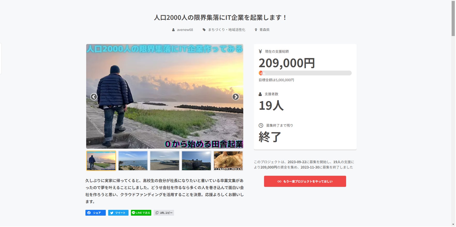 2023/12/01 17:23支援いただいた皆さん。そしてこちらをご覧の皆さん。こんばんは。あべしんです。こちらのプロジェクトは計19名様、209,000円のご支援をいただきました。支援いただいた皆様、そして応援していただいた皆様にお礼申し上げます。本当にありがとうございました。いただいた支援金につきましては法人登記費用として使用させていただきます。実際に登記を行うのは年が変わって来年2024年の2月頃を予定しております。その際はこちらでご報告させていただきます。今年2024年9月22日から走り出した「限界集落にIT企業作ってみるプロジェクト」は来年4月の創業を目指して引き続き動いてまいります。創業はゴールではなくあくまでスタートですが、まずは無事にスタートが切れるようしっかりと準備して参りたいと思います。今後とも「限界集落にIT企業作ってみるプロジェクト」、そして私あべしんの応援よろしくお願いいたします。2023年12月1日Marginal 株式会社(仮) 代表取締役(予定)阿部 新 もっと見る締め切りは今月末11月30日まで!クラファン終了後の流れについて